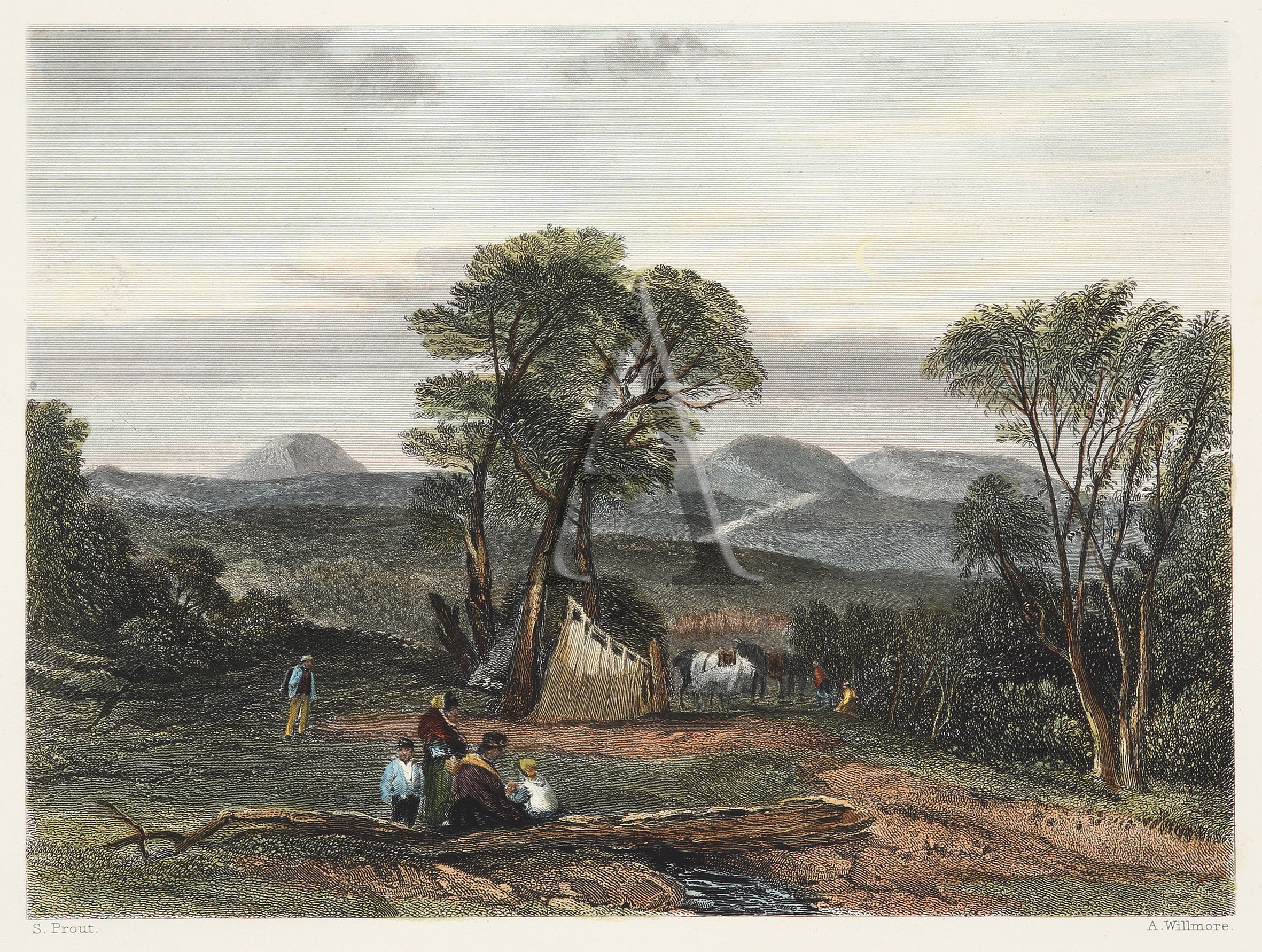 John Skinner Prout (1805-1876) Important colonial artist born in England Prout emigrated to Australia in 1840 with his wife and seven children. He soon became involved in the colonial life as a commercial artist, lecturing and publishing his own series of lithographs titled, Sydney Illustrated and Tasmania Illustrated in 1844-1846. His time in Tasmania teaching drawing, sketching and watercolours created interest and fostered a number of colonial amateurs. He is represented in all major institutional collections. English artist, born in Plymouth, the nephew of Samuel Prout (1783-1852), whose architectural works were praised by John Ruskin. In 1828, John married Maria Heathilla Marsh in Devon. He taught himself art and dabbled in lithography. His focus was on capturing topographical views of ancient sites in western England. Moving to Sydney in 1840, he faced challenges but found success, including illustrating a journal and giving art lectures. He later visited Tasmania, where he gave popular lectures and published illustrated works. Tragedy struck with the death of his son in 1845. Prout returned to London in 1848, where he continued to promote Australian themes through lectures and publications. He died in 1876, leaving behind a significant artistic legacy. His influence on Tasmanian art was profound, inspiring a surge in landscape painting.