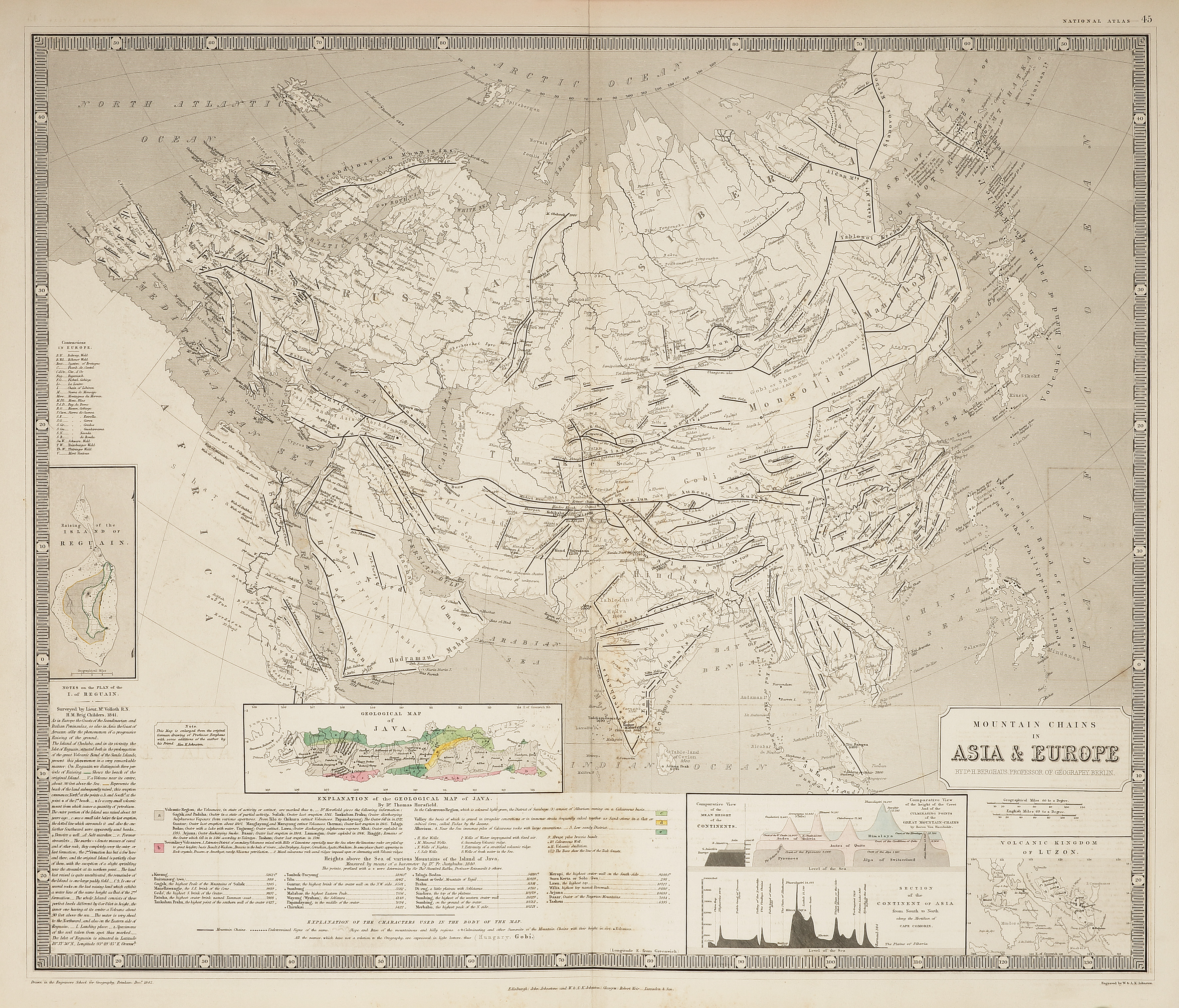 Detailed geological map of Asia and Europe with extensive detail and with insets of Java, Raising of the Island Reguain, Volcanic Kingdom of Luzon and the comparative height of the continent of Asia.