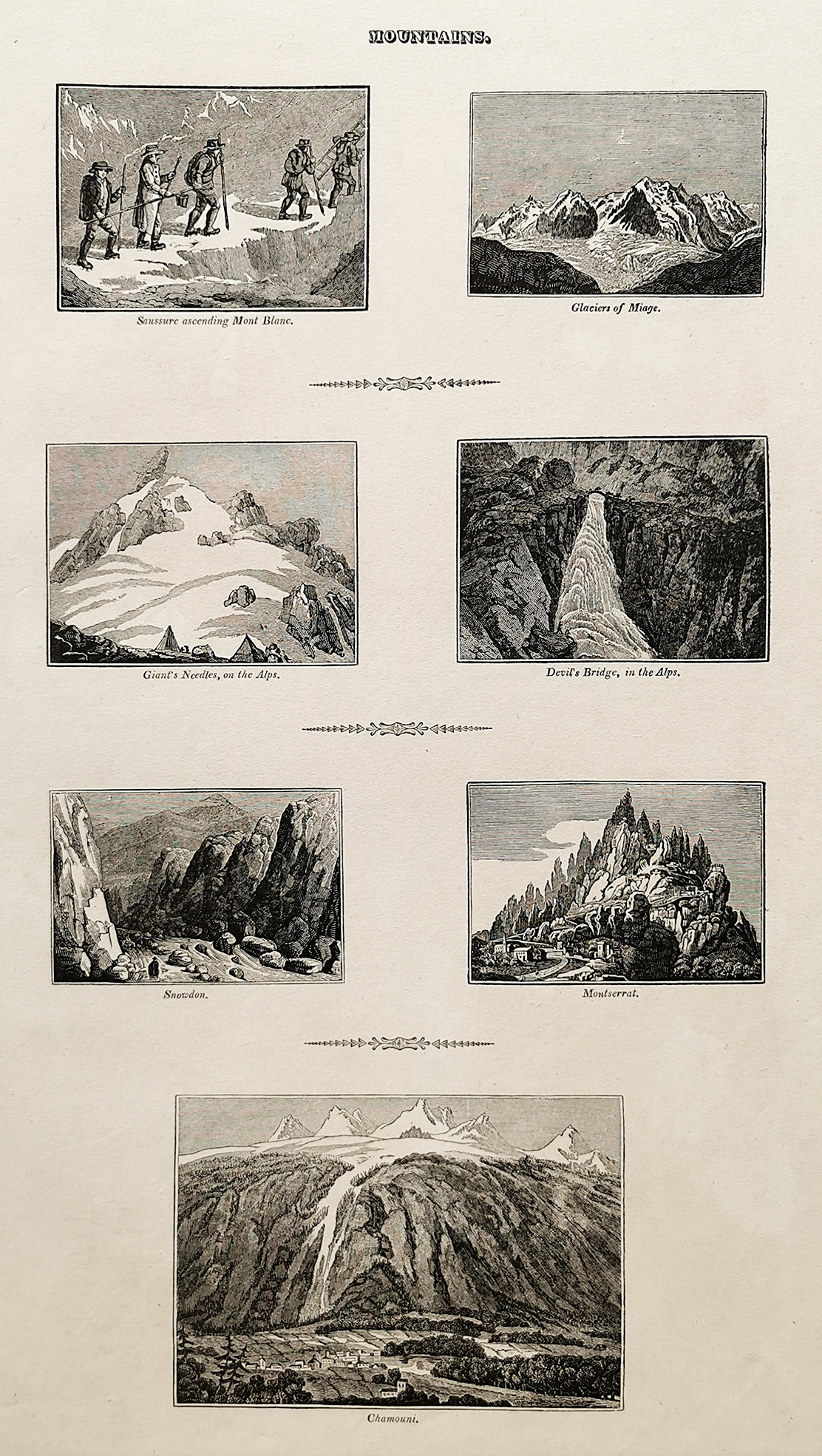 Early C19th engraving of famous mountains. Saussure ascending Mont Blanc.Glacier of Miage.Giant’s Needles, on the Alps.Snowdon.Chamouni.Glaciers of Miage.Devil’s Bridge, in the Alps.Montserrat.