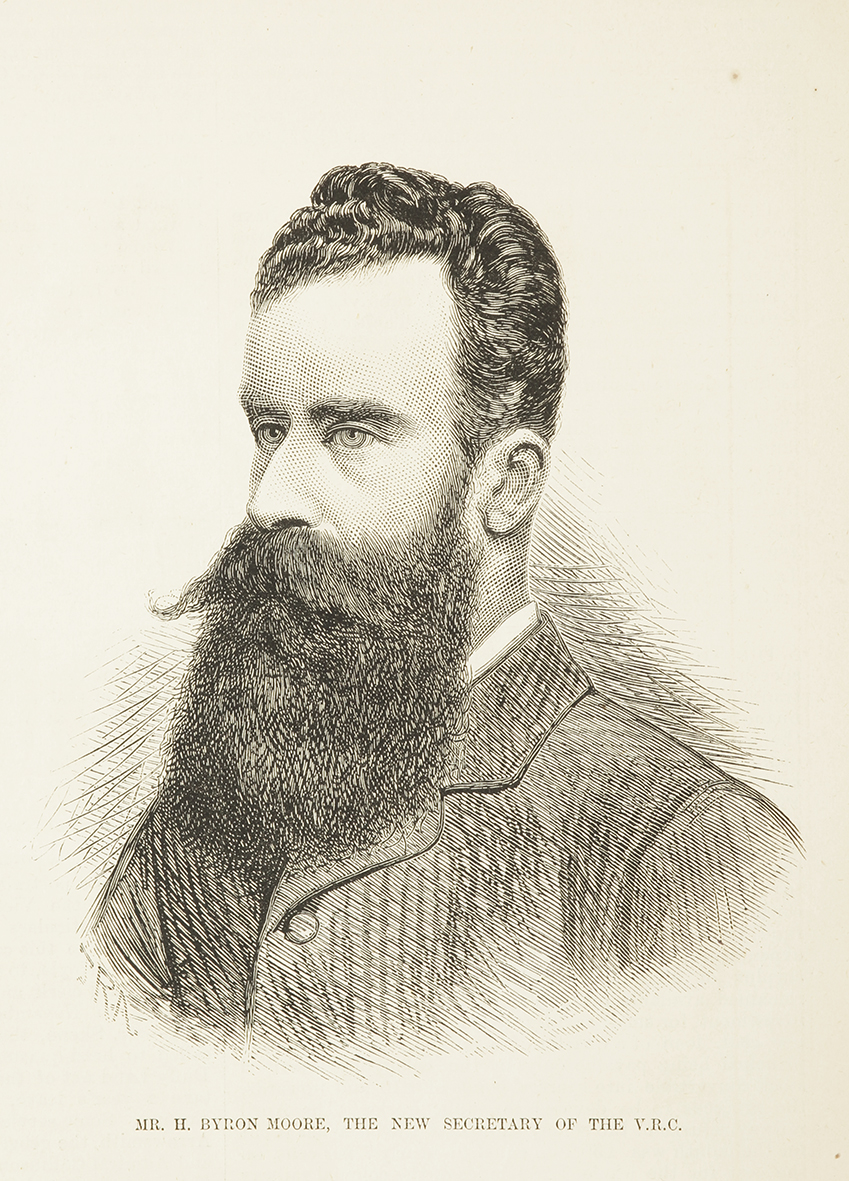 Portrait of Henry Byron Moore. On 17 June 1881 Moore became secretary of the Victoria Racing Club, retaining the post until 1925. He saw the value of acquiring land at the back of Flemington, bought it himself when the committee … Read Full Description