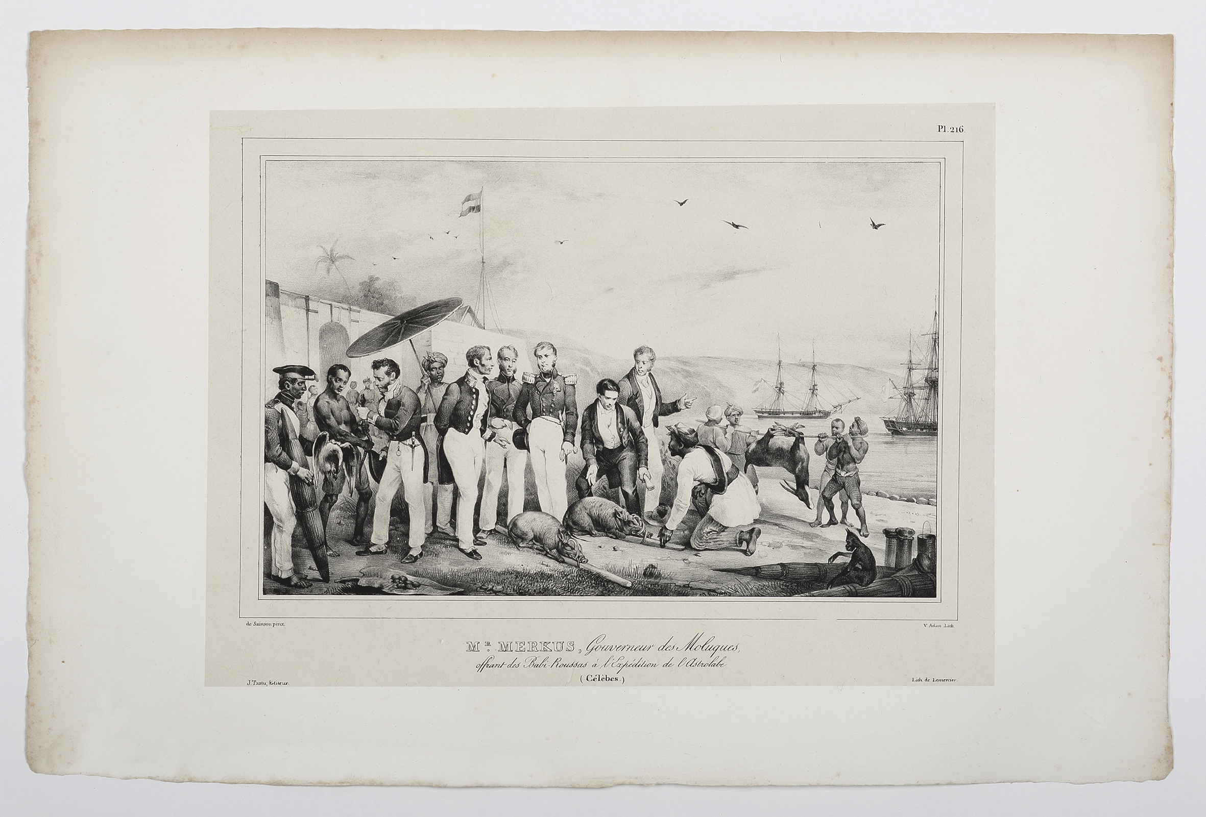 First edition of this superb Chine-collé lithograph on India paper of the scene where the Pieter Merkus (1787-1844), the Governor of the Moluccas, offers the Astrolabe crew two horned pigs (North Sulawesi Babirusa / Babyrousa celebensis) and an antelope at Manado.