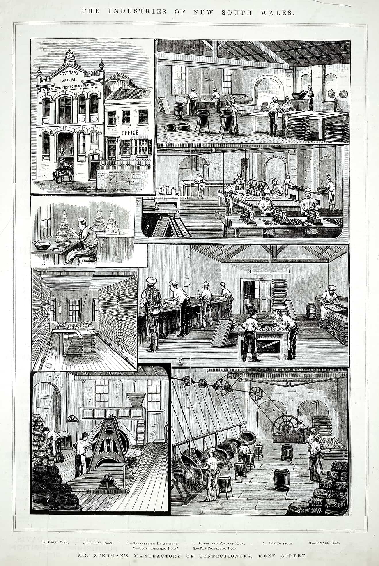 Scarce colonial engraving a colonial confectionary business. Inset titles; 1.-Front view. 2.-Boiling Room. 3.-Ornamenting department. 4.-Jujube and Fondant Room. 5.-Drying Stove. 6.-Lozenge Room. 7.-Sugar Dressing Room. 8.-Pan confecting Room. From the original edition of the Illustrated Sydney News.
