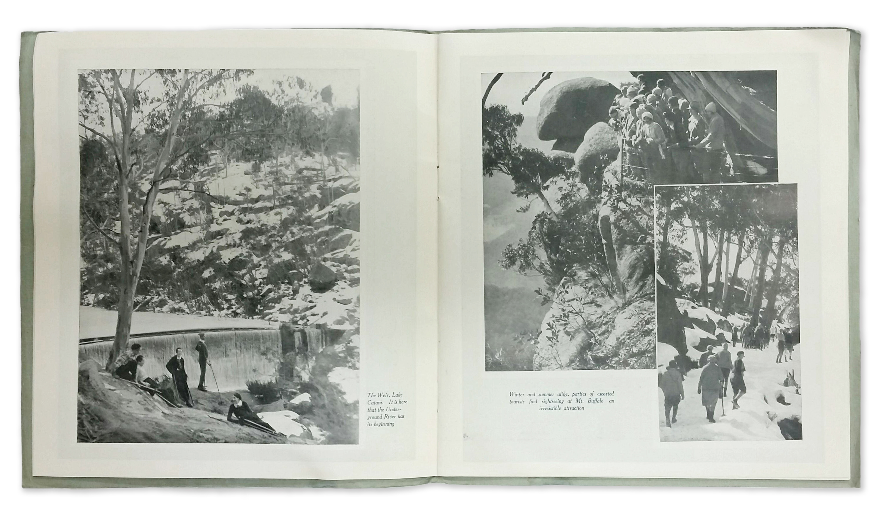 Scarce booklet of Mt. Buffalo National Park, issued by the Victorian Railways, Melbourne. Small quarto, original soft green pictorial wrappers with gold title, pp 32, b/w photographic plates throughout and a detailed folding colour printed map. Extensively illustrated with black and … Read Full Description