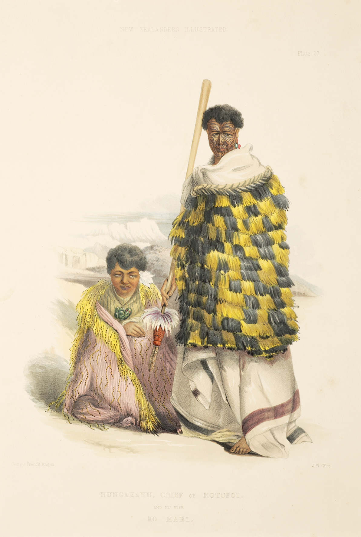 In July 1844 Angas sailed to New Zealand and having arrived unexpectedly at Port Nicholson (Wellington), he travelled to Porirua, where he met Te Rauparaha and Te Rangihaeata. He sailed to Mana Island, south to Cloudy Bay, and then north to Auckland, where he visited Ōrākei pā. In the company of a sub-protector of aborigines, he travelled through Waikato to Lake Taupo and the volcanic plateau, a journey he documented in numerous drawings and watercolours. His portraits and drawings of Māori clothing, artefacts, dwellings and customs formed the basis for the series, New Zealand Illustrated.
