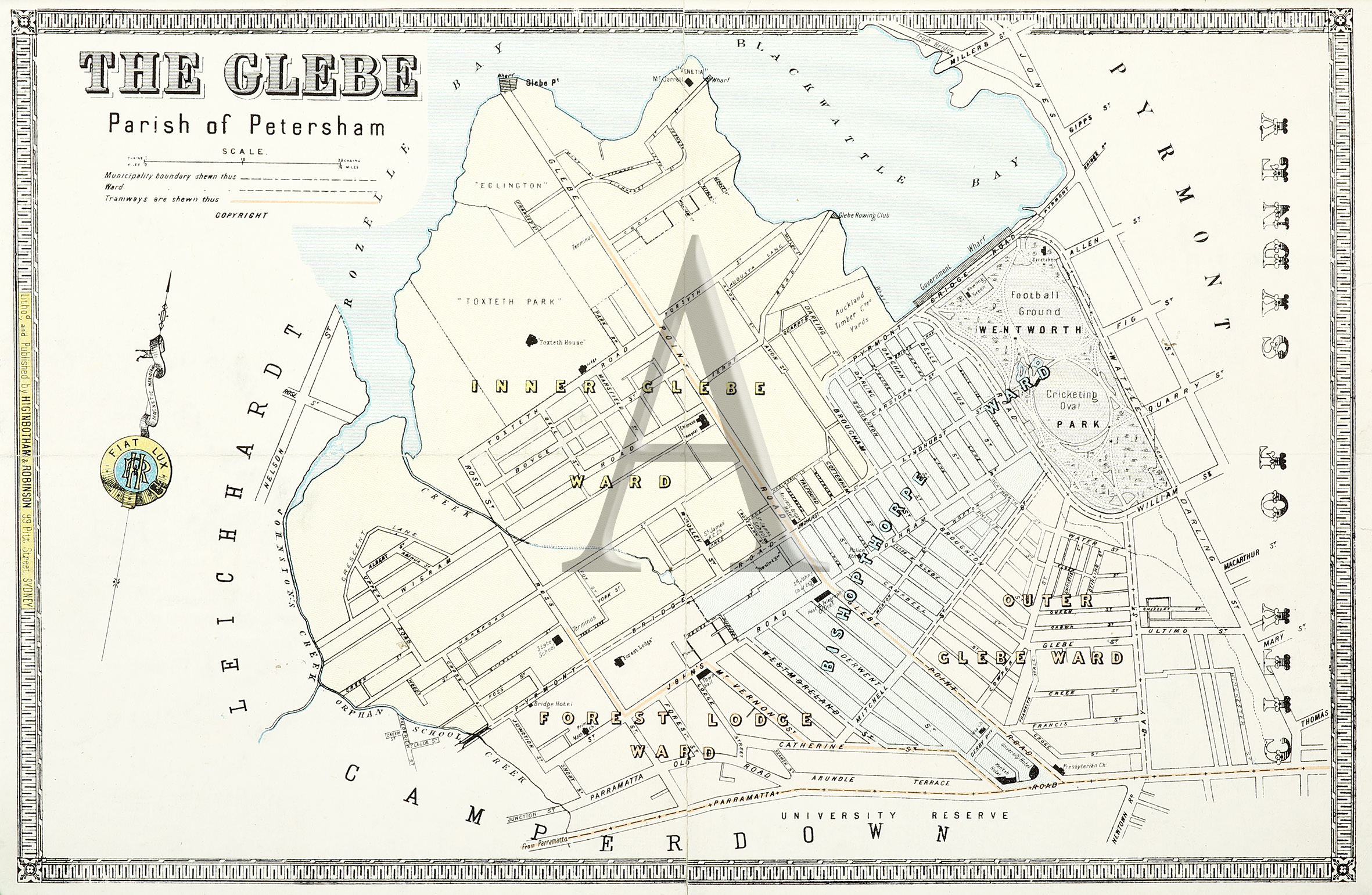 Rare detailed map of Glebe from Higinbotham and Robinson’s, Atlas of the Suburbs of Sydney, shows the municipality with its four wards at a scale of 1:7920 with a north arrow that includes the monogram HR (for Higinbotham and Robinson) inside a conventional garter band with the Latin motto fiat lux. This phrase from the Vulgate Bible (Genesis 1:3) is normally translated as ‘let there be light’ and is used commonly to suggest the pursuit or sharing of knowledge.