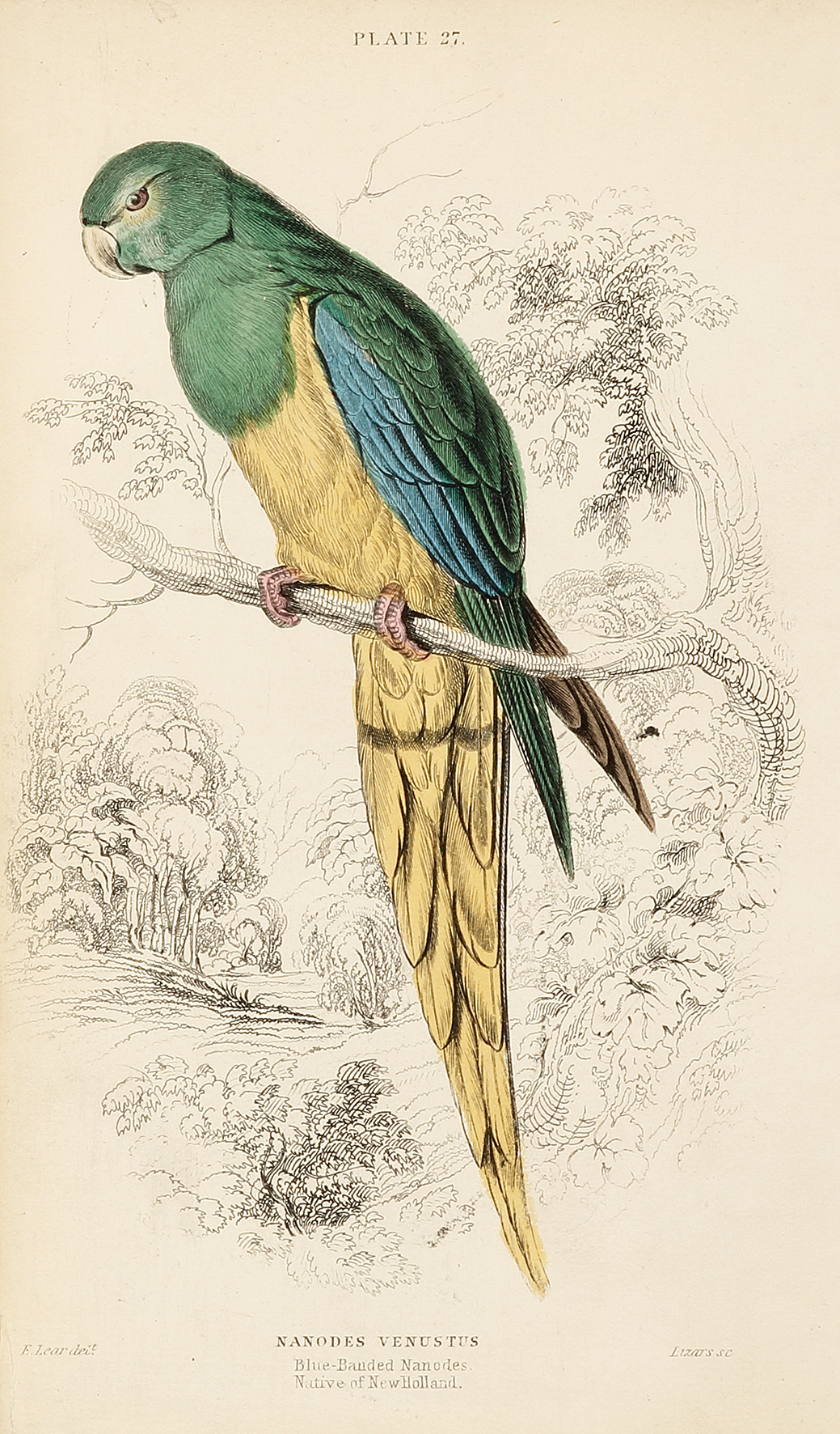 Scarce c.19th hand coloured engraving of the Turquoise parrot by Edward Lear (1812-1888).