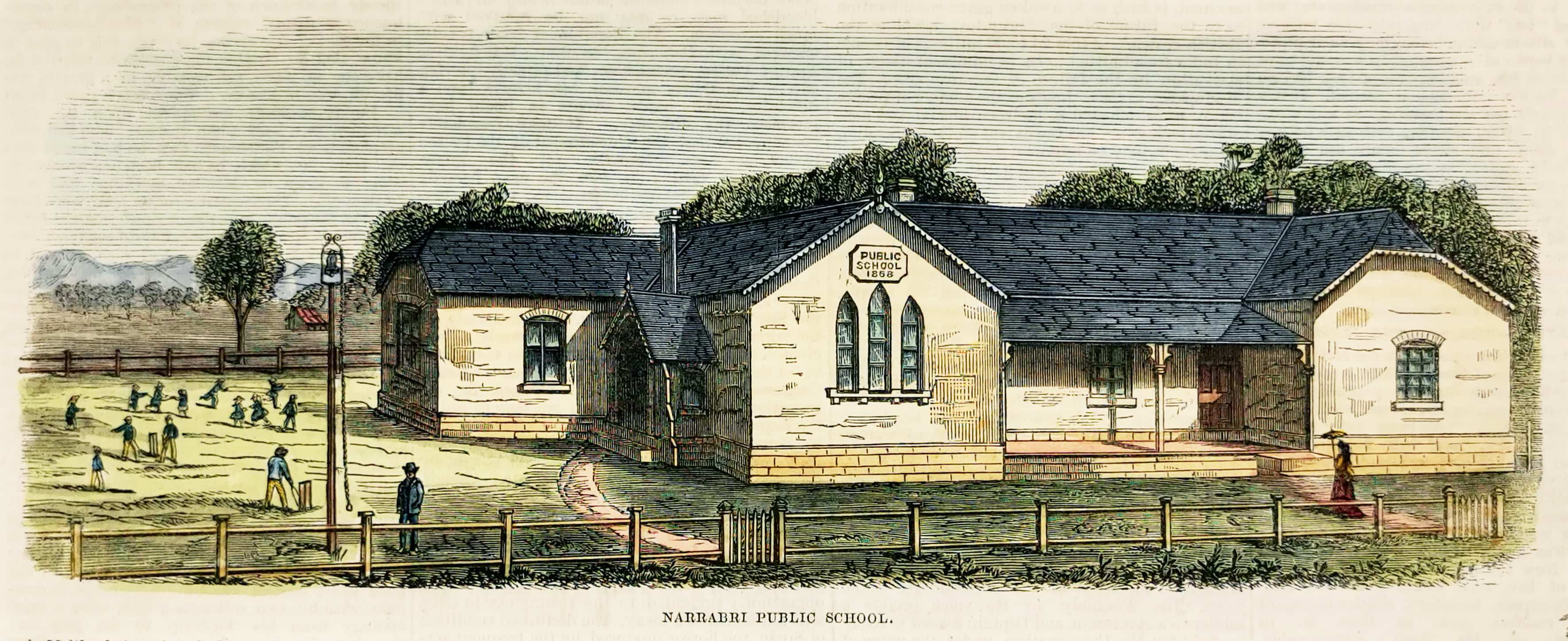 Rare colonial engraving of the original Narrabri school which opened in 1868. From the original edition of the Town and Country Journal.