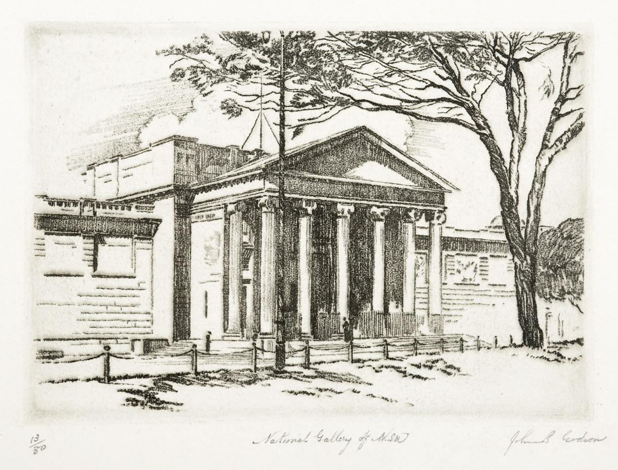Godson was born in Newcastle, England and 190 his occupation was recorded as ‘Art Pupil Teacher’. He studied etching at the Royal College of Art in London under Sir Frank Short. On 13 May 1911, giving his occupation as Art Master, J. B. boarded the ship Togariro from London to Wellington, New Zealand to take up a staff position at Auckland Technical College[1911-1913]. Barclay then moved to Australia from Wellington on 4 August 1914. In 1916 the Art Gallery of New South Wales bought a print of “Cobles at Staithes, Yorks”, dated 1911. In 1920 Godson was a founding member of the Australian Painter- Etchers’ Society, exhibiting twelve prints in their inaugural exhibition in 1921, including ‘Cobles at Staithes’. He married Mary E M Coleman in 1921 in Sydney. She died 1926 along with their son, John M Godson at Chatswood NSW. In 1930 J. B. lived at 145 George Street North, Darling Harbour, West Sydney and in 1931 he married Hilda Mary P Kettley at Sydney. Between 1929 and 1933 he advertised in the Sands Directory with a working address on Alfred Street, North Sydney. In 1933 J. B. and Hilda lived at 52 Phillip Street, King, East Sydney, but by 1936 had moved to 27 Awaba Road, Warringah, Mosman. The following year [1937] they were at 10 Upper Avenue Road and he gave his occupation as Art Teacher as opposed to artist which he had stated in earlier electoral rolls. In 1940 J. B. painted a portrait of Mrs R G Gardiner, the daughter of a local dignitary. In 1943 J. B. and Hilda had moved to 10 Warringah Road, Warringah but by 1949 they were living at 46 Smith Road, Bennelong, Artarmon. They were still at this address in 1954. Hilda died in 1955. John Barclay Godson died in Artarmon, Sydney, New South Wales in 1957, aged 82.