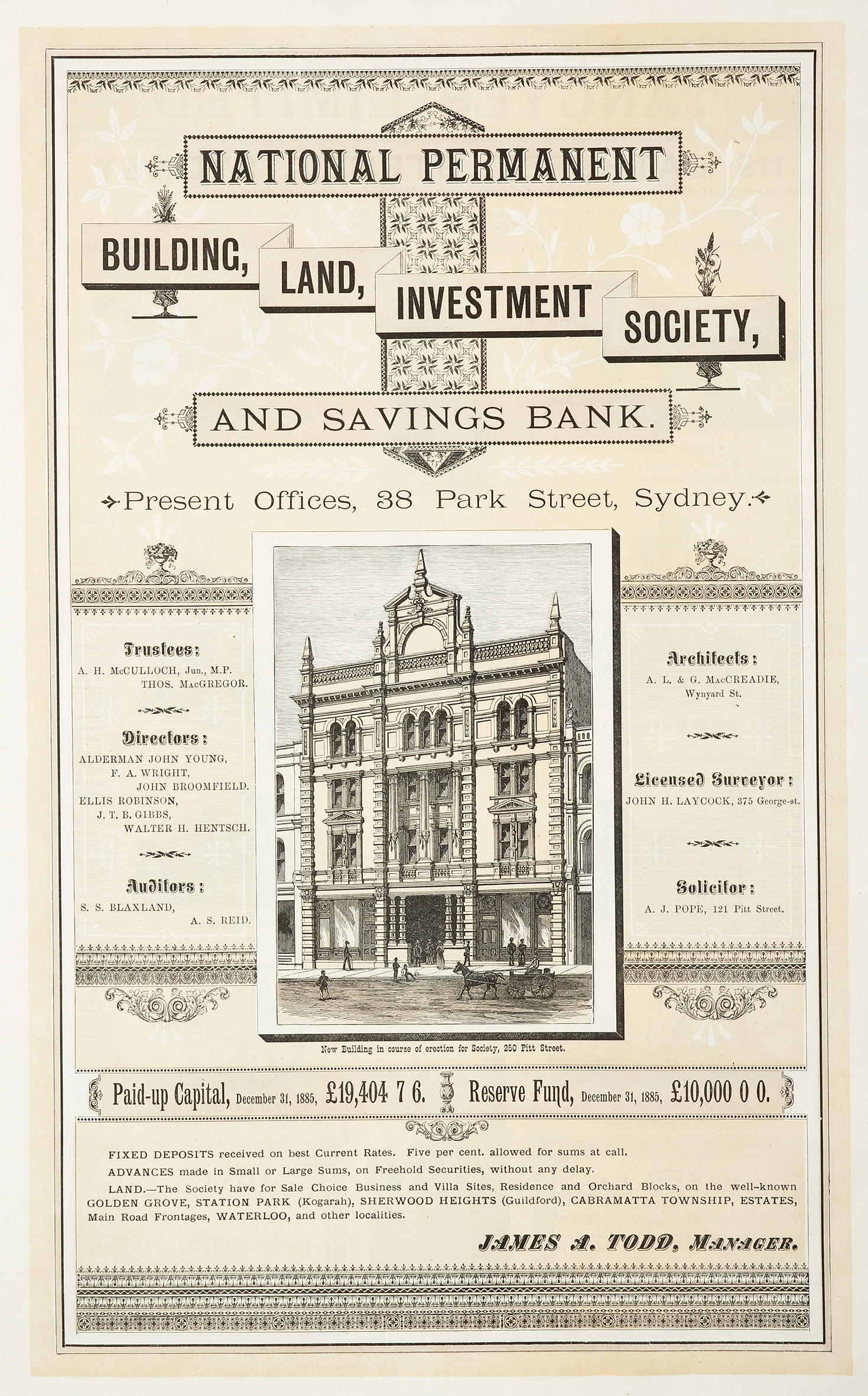 Large c.19th engraving of the new offices in the course of erection for the Society at 250 Pitt Street, Sydney.