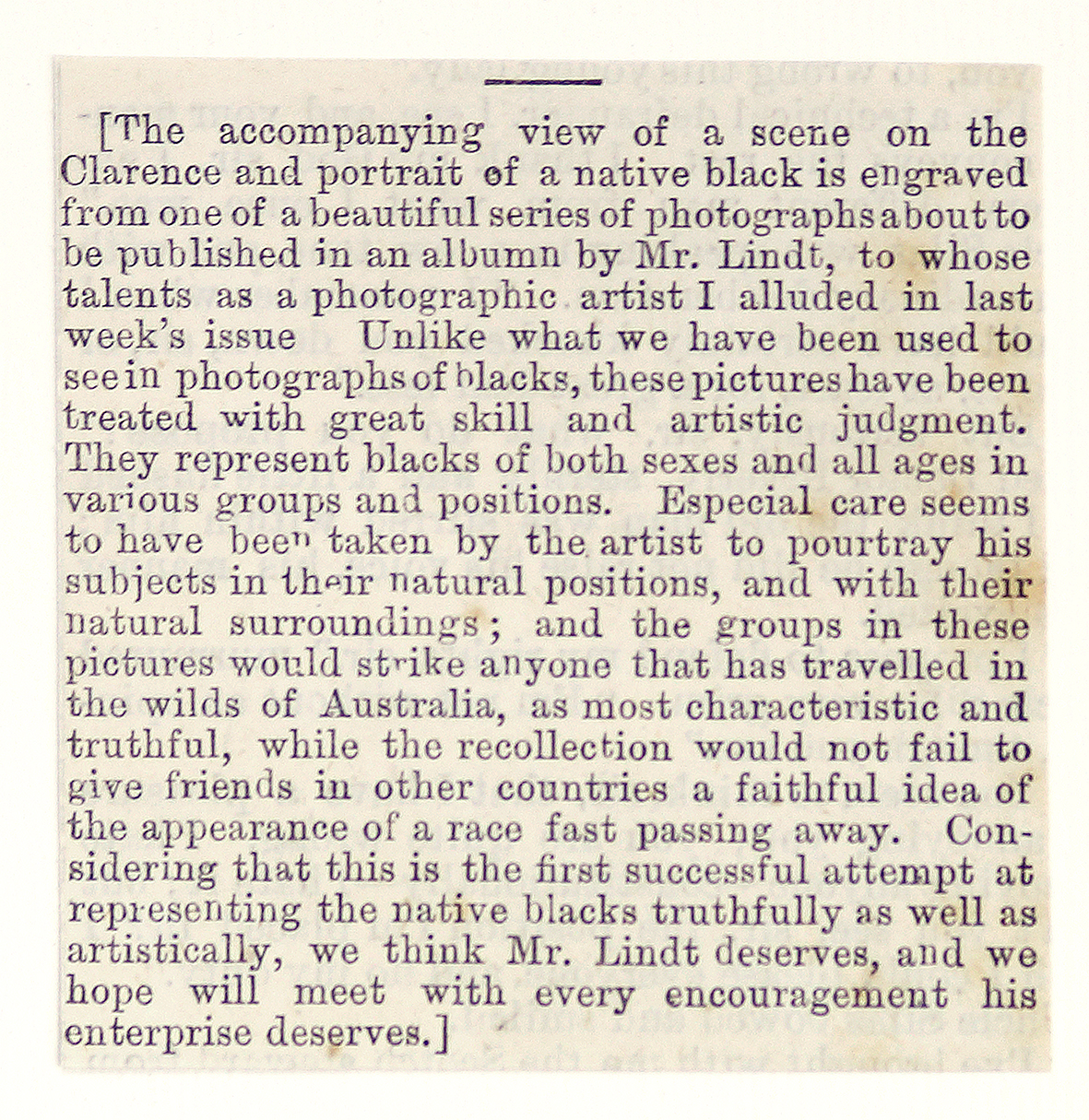 Very rare engraved portrait of a Clarence district aboriginal taken from a Lindt photograph issued prior to the publication of Lindt’s album. There is an accompanying description which states ‘from one of a beautiful series of photographs about to be published in an album by Mr. Lindt…’.