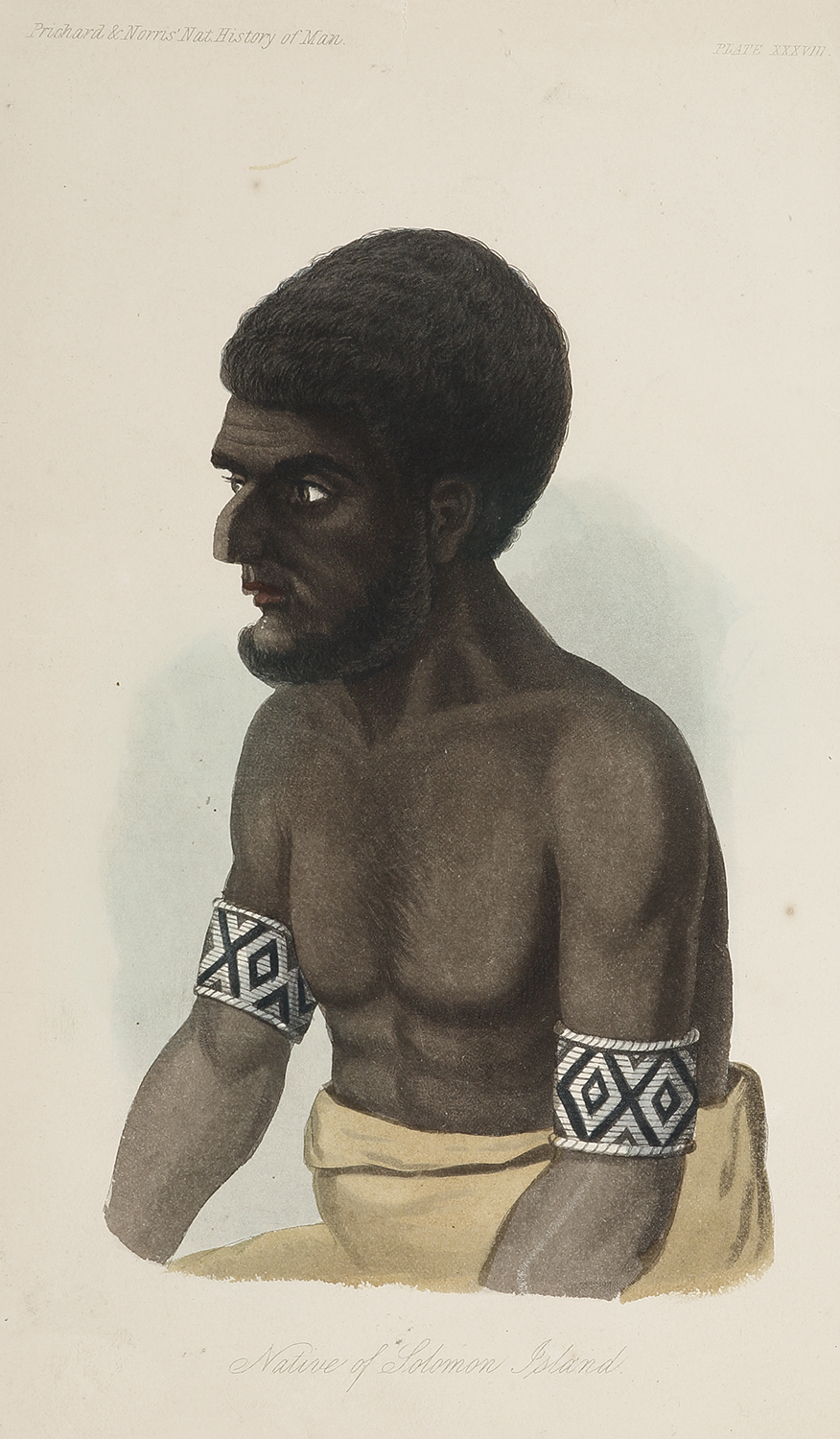 Mid c.19th portrait of an indigenous man of the Solomon islands. From The Natural History of Man, Comprising Inquiries Into the Modifying Influence of the Physical and Moral Agencies of the Different Tribes of the Human Family.
