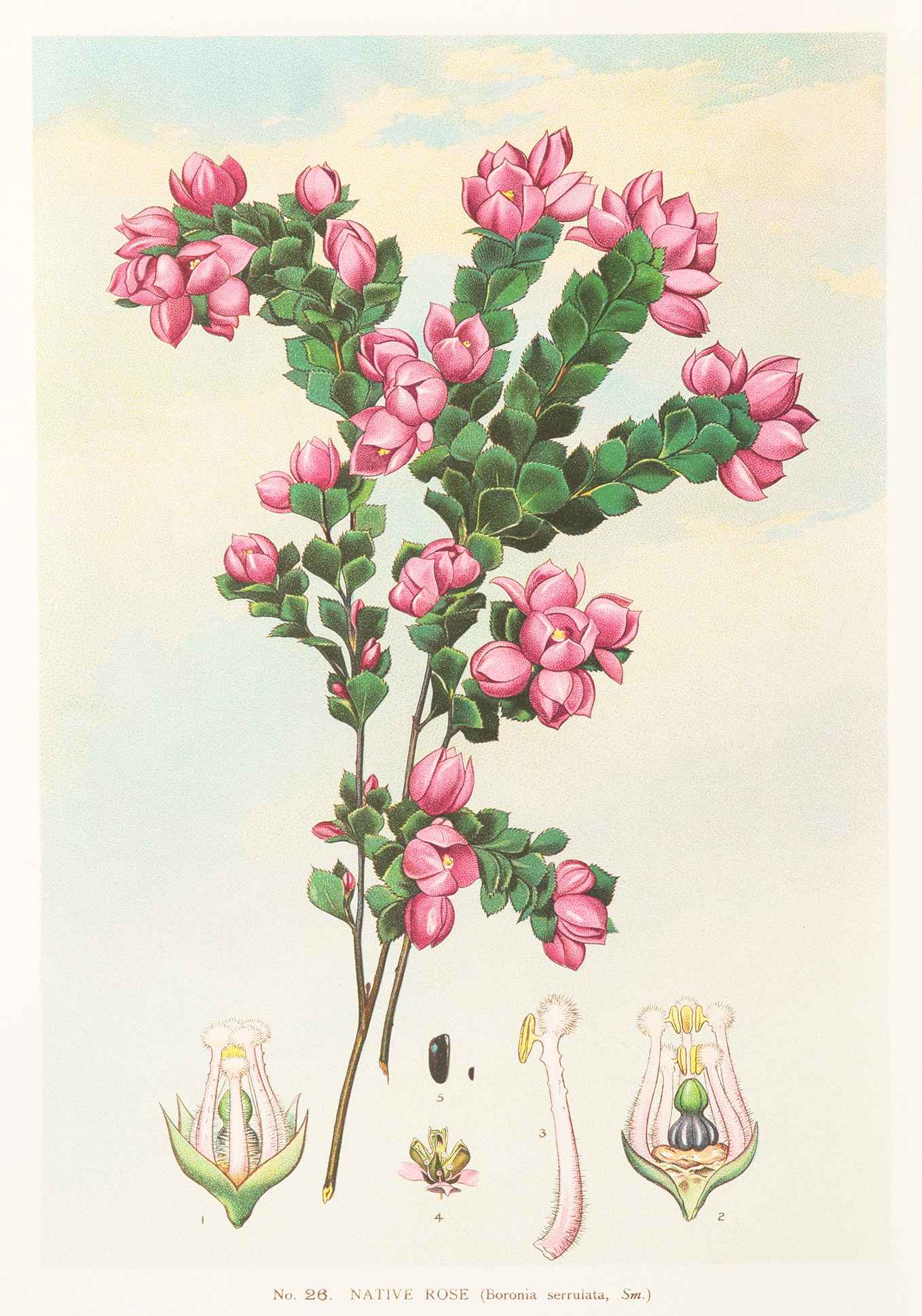 Scarce c.19th lithograph of the Native rose by Joseph Maiden. Common names: Native rose, Rose boronia, Sydney rose Modern binomial name: Boronia serrulata First described: James Edward Smith, 1798 Distribution: NSW References: Ferguson, J. A. Bibliography of Australia Volumes 1-8, … Read Full Description