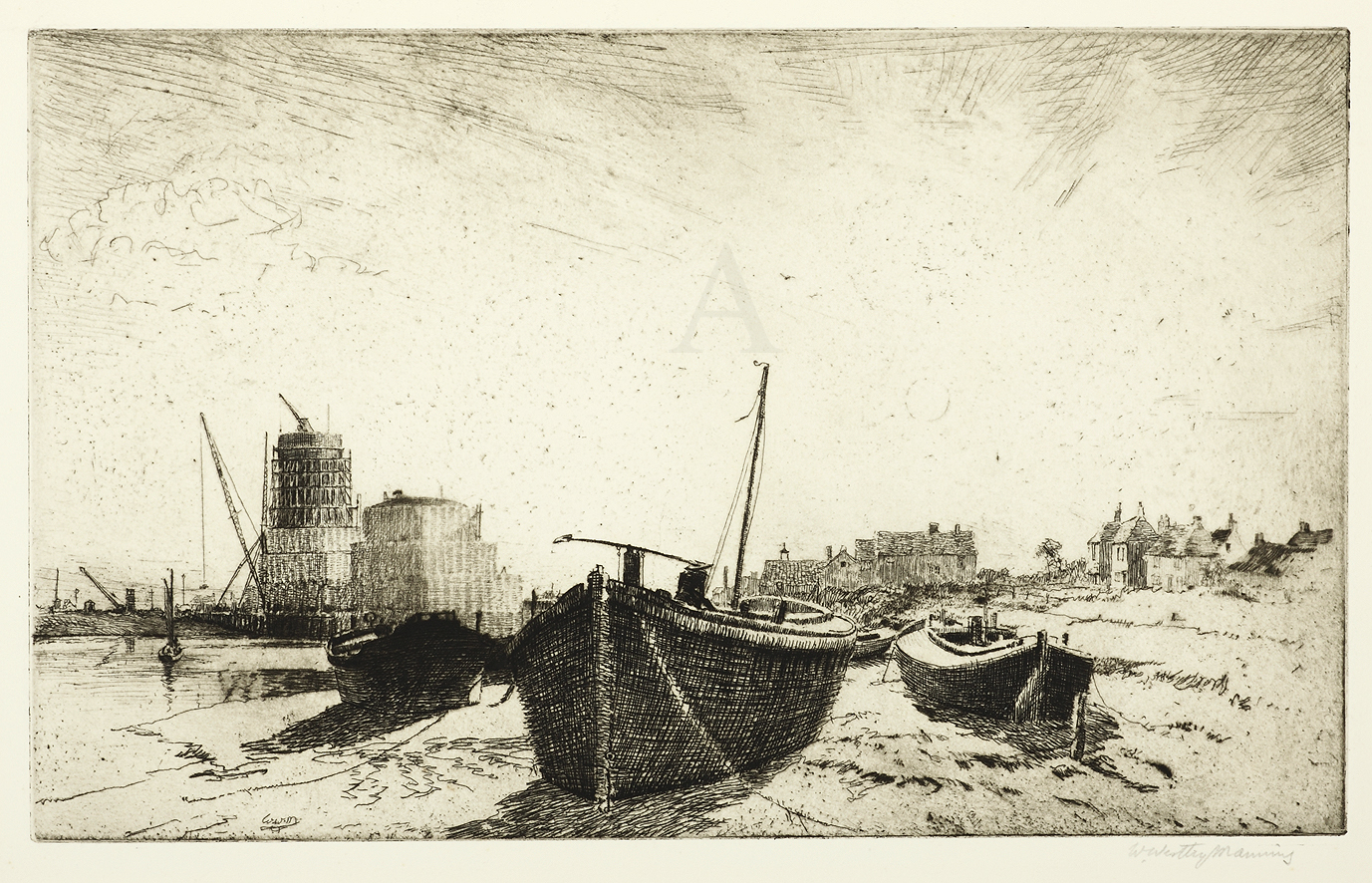 William Westley Manning (1868-1954) was a British landscape painter, etcher and aquatinter. Born in Marylebone, London, he studied initially at the Slade School of Fine Art, at the Académie Julian, Paris in 1892, and then at the Central School of Arts and Crafts under Malcolm Osborne. He was a prolific exhibitor including the Baillie Gallery, Chenil Gallery, Fine Art Society, Goupil Gallery, New English Art Club, Royal Academy, Royal Institute of Oil Painters and at many other venues in England and abroad. He was elected RBA in 1901, Associate of the Society of Painter-Etchers (ARE), 1919 and member of the Royal Institute of |Painters (ROI), 1918; he travelled extensively and was a frequent visitor to Cornwall and a member of the St Ives Society of Artists 1938-49. His work is in many public collections including the Victoria & Albert Museum and the British Museum.