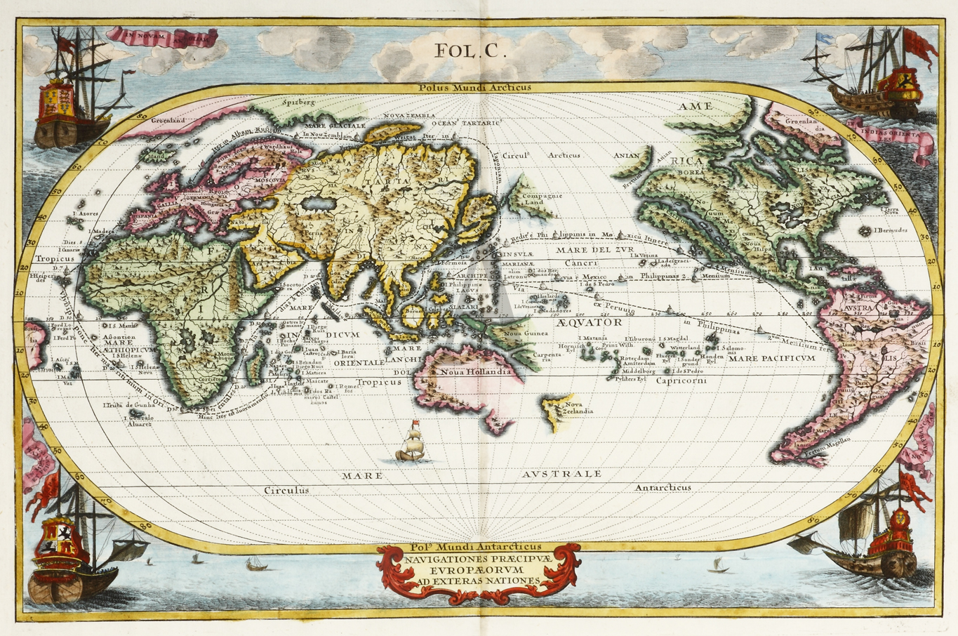 Decorative world map by Scherer, a Jesuit professor of mathematics, with four galleons in each corner representing the major trading powers Britain, France, Holland and Spain. The old sea route used by the Portuguese along the east coast of Africa, to Goa, Malacca and Japan as well as that for South America are shown. Also shown is the north east sea route via the Artic that had been sought by the Dutch but never found.