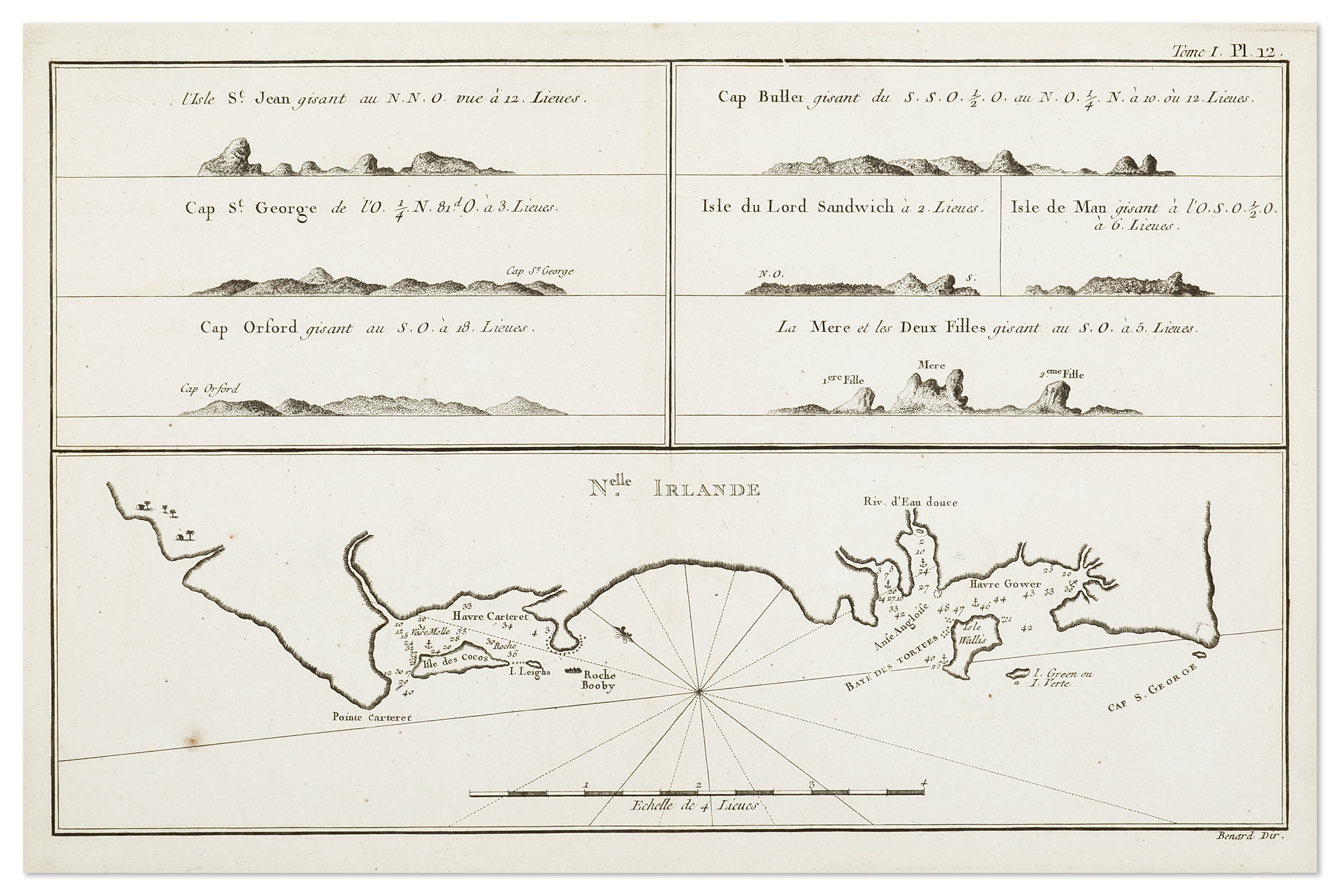 Top right: Cape Buller, bearing from S.S.W.1/2 W. to N.W.by N. distant to or 12 leagues.