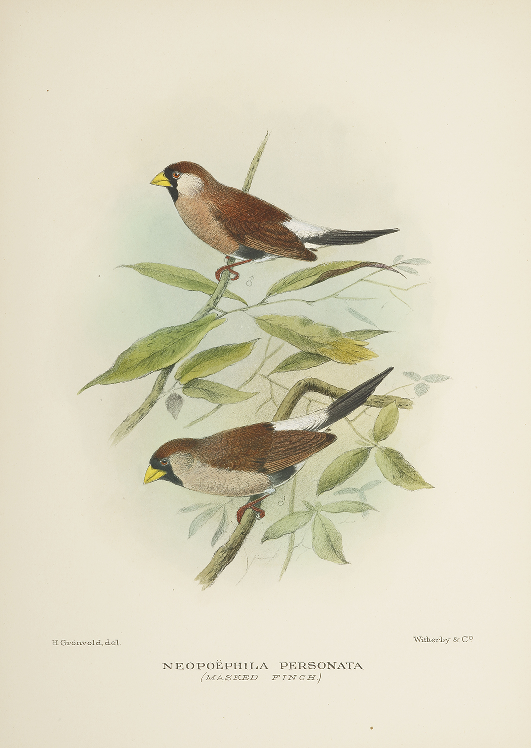 Superb lithograph of the Masked Finch from the last great bird series made using the laborious process of hand colouring of each individual lithograph. The series is rarer than John Gould’s work on Australian birds, with only 225 sets made.