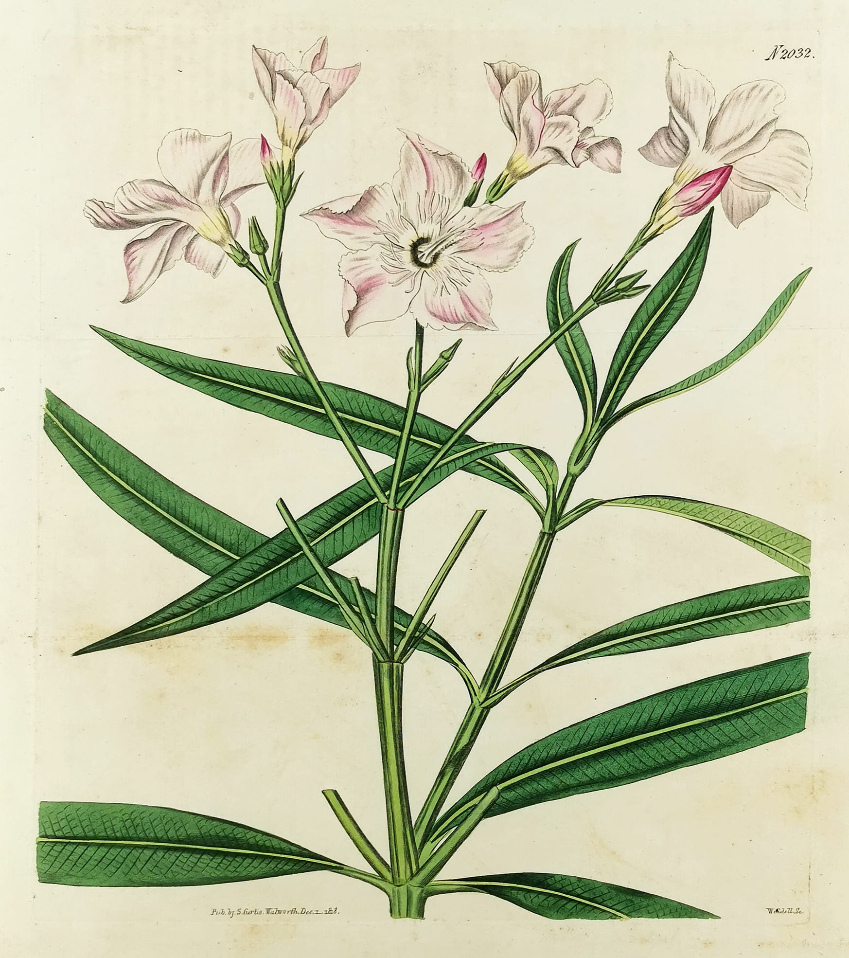 Fine original hand coloured botanical illustration of an oleander or nerium, a shrub or small tree cultivated worldwide in temperate and subtropical areas as an ornamental and landscaping plant. From Curtis’s Botanical Magazine: or, Flower-Garden Displayed..