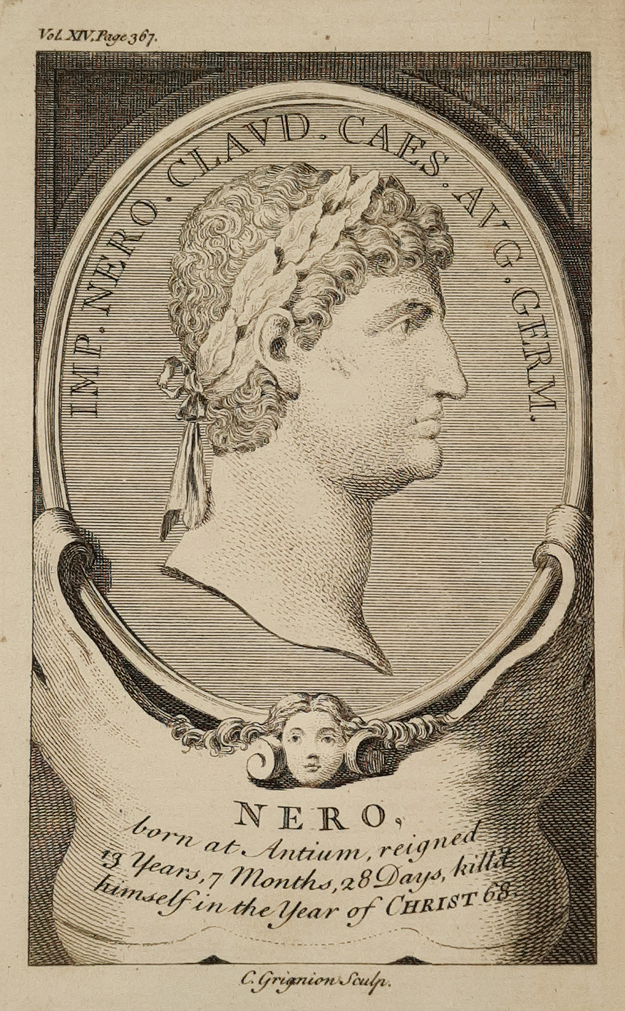 Mid c.18th portrait of Nero (15 December 37 – 9 June 68 AD) the fifth Roman emperor, ruling from 54 to 68. His infamous reign is usually associated with tyranny, extravagance and debauchery.[2][ii][iii] Nero, originally named Lucius Domitius Ahenobarbus, belonged to the Julio-Claudian dynasty, and was adopted as heir by the emperor Claudius, his great-uncle and stepfather. Nero succeeded Claudius while not yet aged 17, and his mother, Agrippina, tried to dominate his early life and decisions, but Nero cast her off and had her killed five years into his reign.