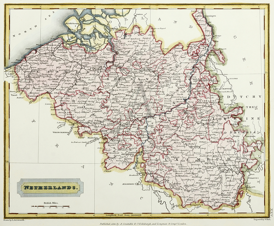 "Easily the foremost cartographer of his time" (Tooley) The Arrowsmiths were the leading British map publishers in the early 19th century founded by Aaron Arrowsmith. Born in an impoverished family, at Winston, Durham, 14 July 1750. He came to London about 1770 and although self taught he established himself as a land surveyor and worked for other publishers such as Faden and Cary. In 1790 he set up in his own establishment in Castle Street, Long Acre as a publisher and engraver. His first production was A Chart of the World on Mercator's Projection, Showing all the New Discoveries. This was published on 1 April 1790, and fore-shadowed the direction of his contribution to geography. He was to concentrate his considerable energies on the production of large scale general charts, recording of the latest geographical discoveries. His maps were sold singularly in sheets or collections but not in published atlas format and were constantly revised. He was Hydrographer to the Prince of Wales from about 1810 and subsequently Hydrographer to George IV. He used the material of important contemporary explorers such as Bass, Flinders and Colnett and had the confidence of travellers who sent him their manuscripts or information for inclusion in his maps. He received assistance from Dalrymple, Rennell, the Hudson Bay Company, the Ordance Office and the East India Company.