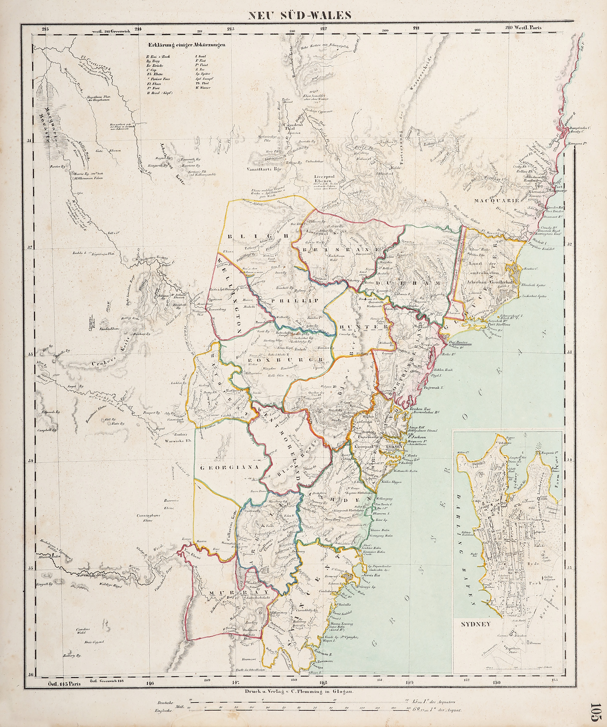 Scarce, detailed c.19th hand coloured lithographed map of New South Wales, showing the ‘nineteen counties’, extending from Trial Bay in the north to Moruya in the south, with an inset of Sydney at lower right.