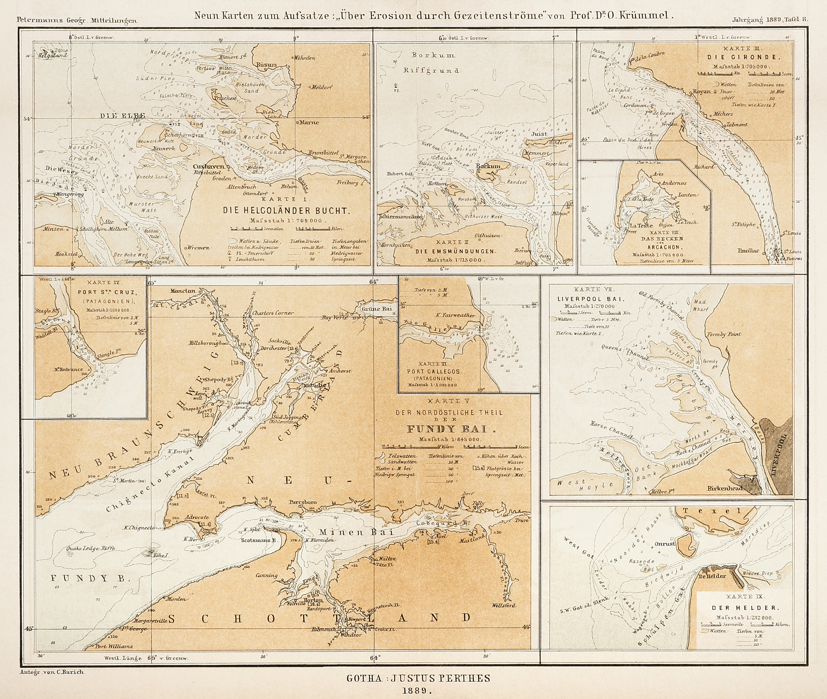 Scarce map of showing tidal erosion of nine ports by Prof. Dr. O Krummel. From Petermann’s, Geographia Mittheilungen.