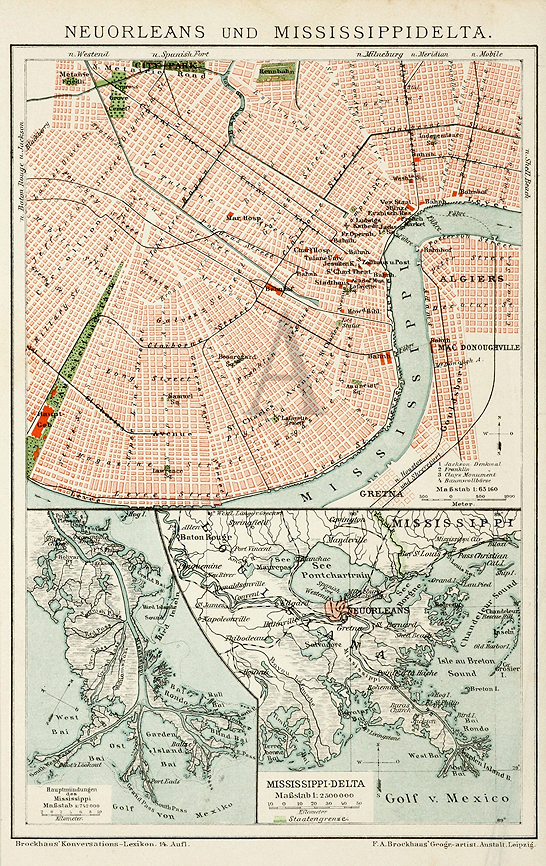 Detailed German plan of New Orleans. The lower sections show the harbour while the upper portion shows the citywith street names. From Brockhaus, F.A. Konversations Lexikon. Collections: National Library Australia: Bib ID 1104411