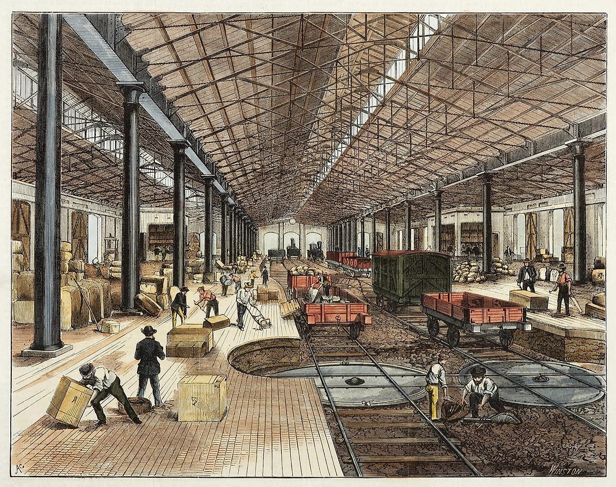 Rare colonial engraved view of the interior of the trains sheds at Spencer Street station, Melbourne.