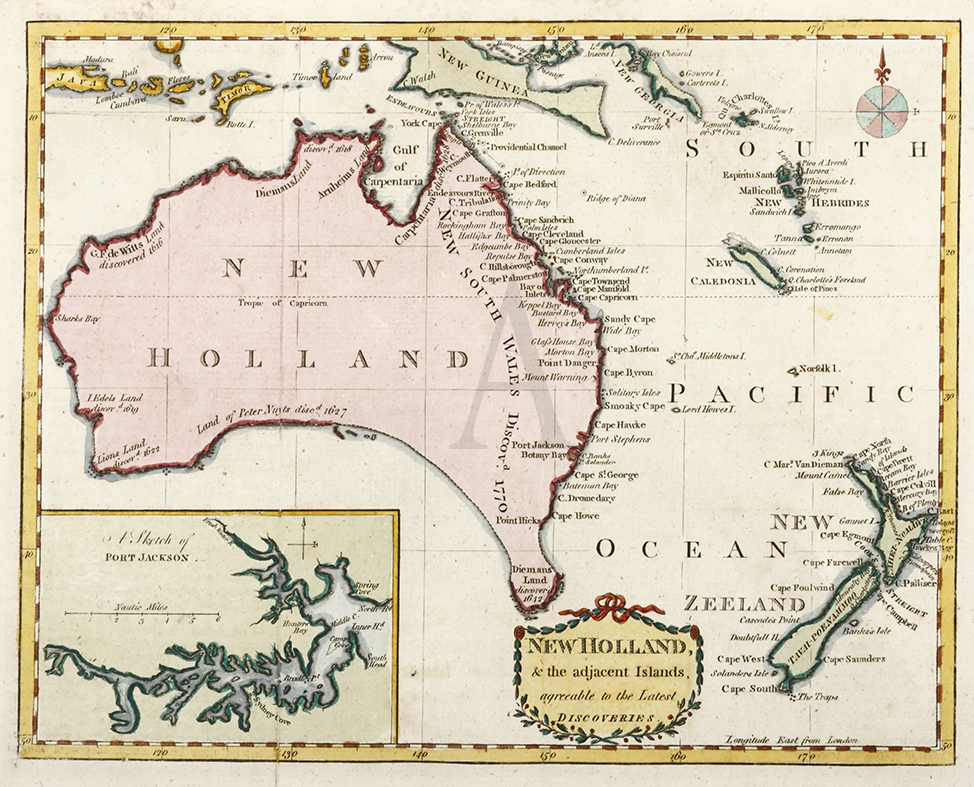 One of only a few pre-1800 maps solely focused on Australia, and only found in the third edition of Alexander Kincaid&#8217s A new geographical, historical, and commercial grammar which was a copy of William Guthrie&#8217s work of the same title. Kincaid added a further fourteen maps to the third edition including this one by John Andrews. Kincaid was one of a number of Scottish publishers actively republishing English books at lower prices. This was possible due to a loophole in the Copyright Act and a subsequent ruling by the Scottish Court of Session in 1751 which allowed any book not registered at Stationer&#8217s Hall to be copied legally in Scotland. Although the map does not identify the mapmaker or engraver, it has previously been attributed to Kincaid on the basis that another map, titled Southern Hemisphere, which appears in all three editions of his geography and also depicts Australia prior to the discovery of Bass Strait, notes him as &#8216del.&#8217 (delineator or creator). The geography and nomenclature of both maps are clearly based on John Andrew&#8217s A New Chart of New Holland , issued in William Eden&#8217s History of New Holland 1787. Due to the reduced size of Kincaid&#8217s New Holland map, a number of place names have been removed and the inset map of Botany Bay has been replaced with a map of Port Jackson, based on John Hunter&#8217s chart which was first issued in Governor Phillip&#8217s account of 1789. In an advert for his book, Kincaid wrote: &#8216The whole executed on a plan similar to that of W. Guthrie &#8230 by a Society in Edinburgh &#8230 Embellished with an elegant set of maps, engraved on purpose, more numerous, accurate and exhibiting more fully the new geographical discoveries than those to be met with in any former publication.&#8217 It is clear that Kincaid not only copied Guthrie&#8217s book but also used information from earlier published maps issued in the first fleet accounts. Kincaid&#8217s work is historically significant as it disseminated the latest knowledge and discoveries of Australia to a much wider audience than Eden&#8217s very scarce work. From Alexander Kincaid&#8217s A New geographical commercial and historical grammar , 1799. References: Kissajukian, Louis ‘South Land The Search for Spices Maps 1513-1811’