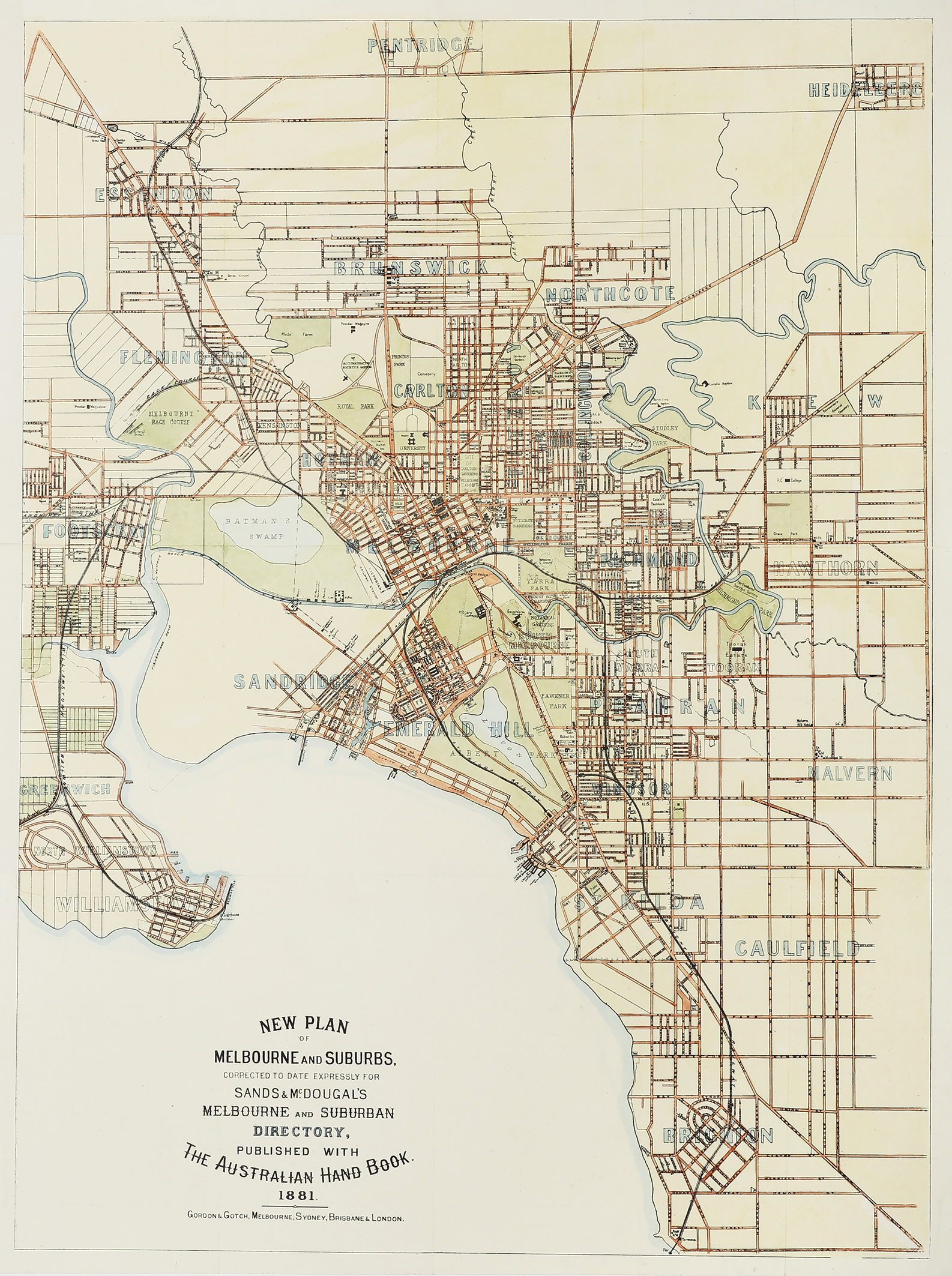Very detailed up to date street map of Melbourne dated 1882, showing the suburbs of Carlton, Hotham, Melbourne, Sandridge, Emerald Hill, Caulfield, St. Kilda, Prahran, Kew, Richmond and Hawthorn with railways marks.