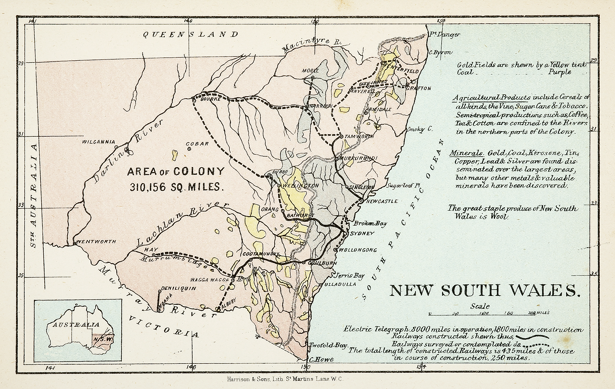 Informative small map of New South Wales noting, gold fields coloured in yellow and coal in purple. Inset map of Australia at lower left.