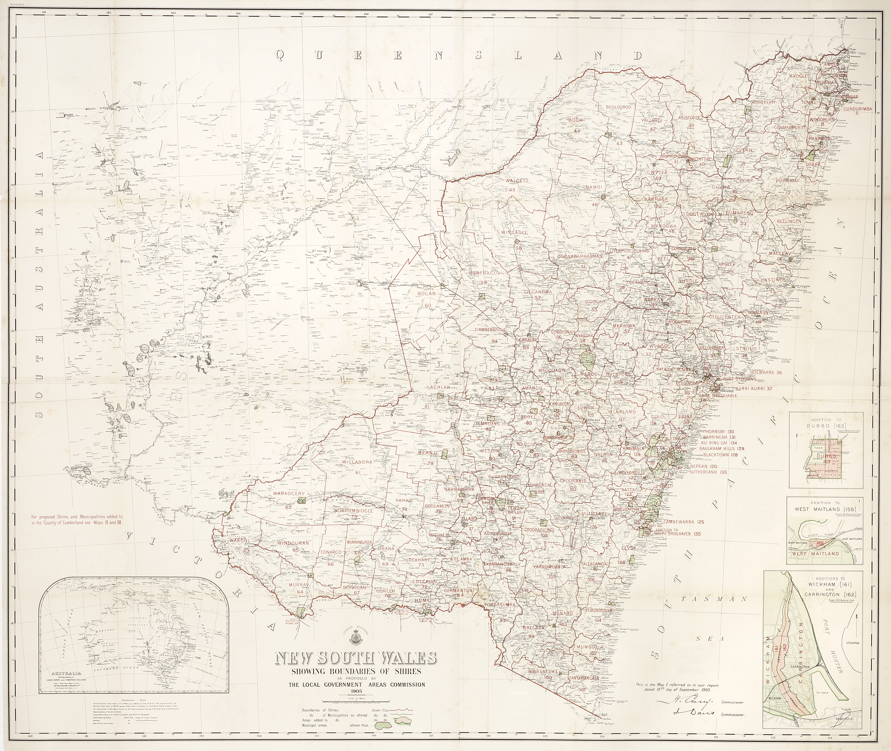 Very large wall sized map of New South Wales showing proposed boundaries and shires as of 1905. The map was based on the trigonometrical survey of the state and on astronomical determinations of certain positions. Shown are public watering places, … Read Full Description