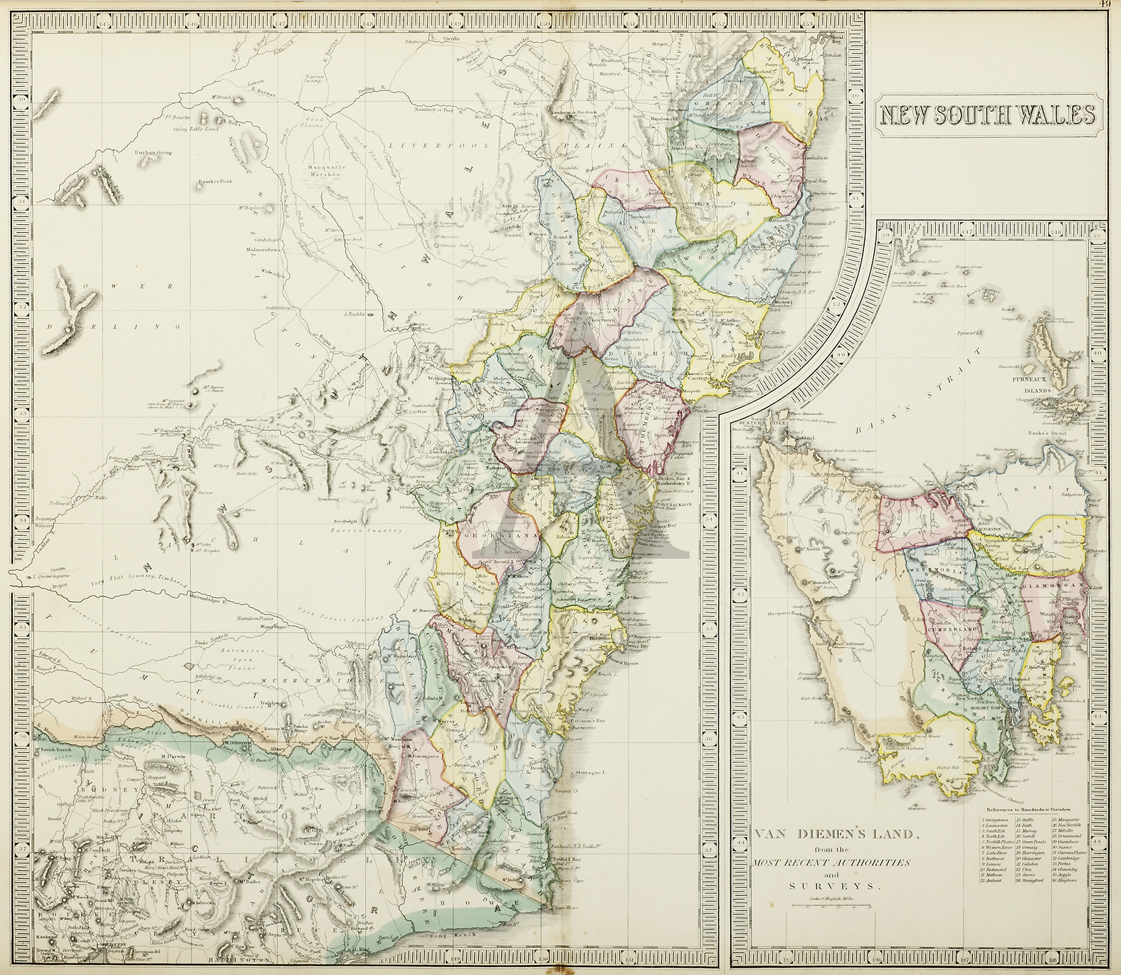 From Philips’ New General Atlas, large scale detailed map of New South Wales and Tasmania. List of 36 counties in Tasmania.