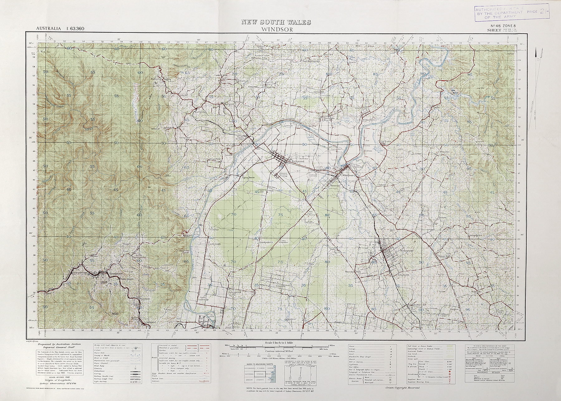 Scarce World War II period military map of the Windsor region, New South Wales with extensive detail, first issued in 1942 and this issued is dated 1955.