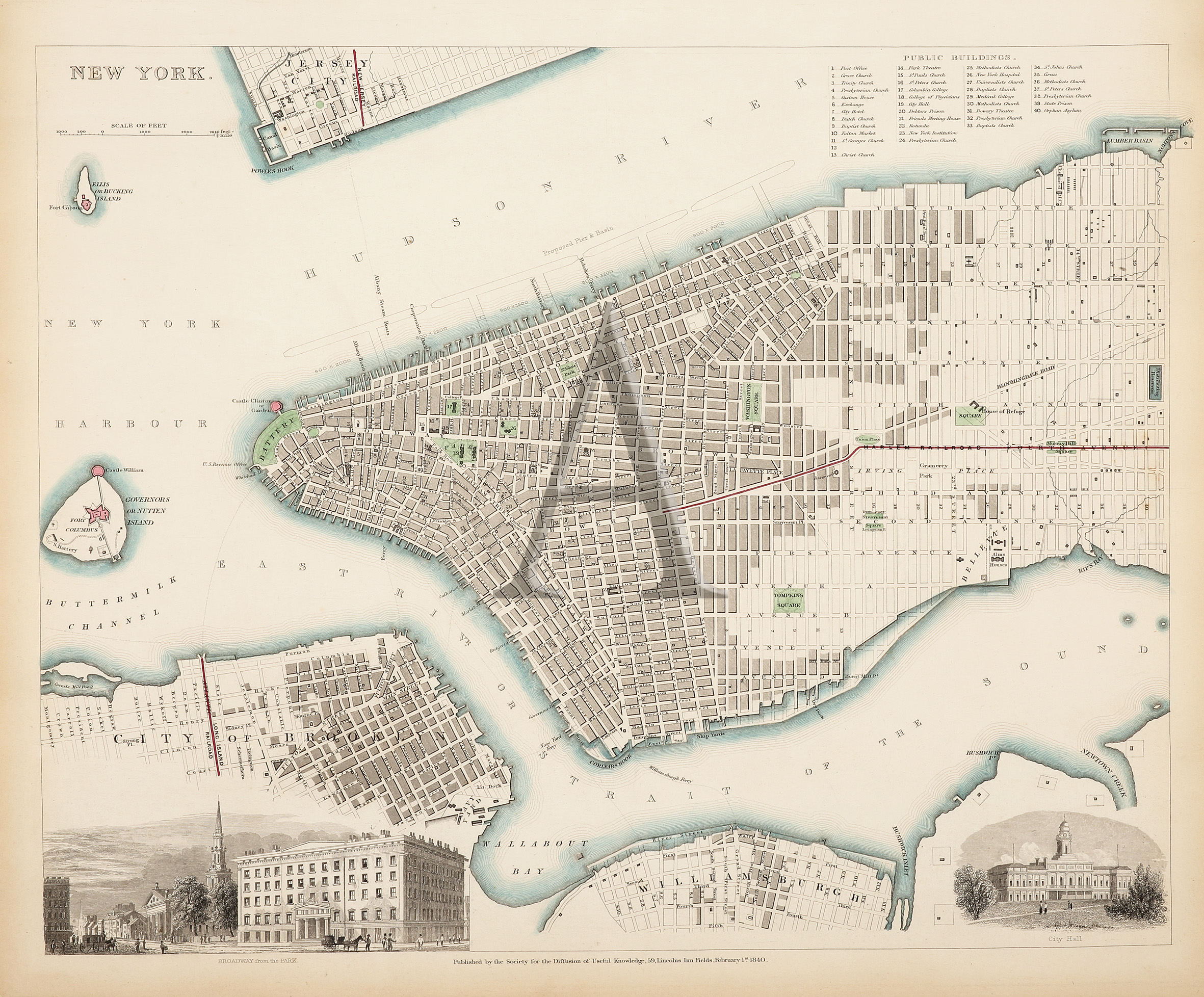 Detailed plan of New York with engraved views of: Broadway from the Park, and City Hall. There is a key to the public buildings located at the top right of the map. Published by the Society for the Diffusion of … Read Full Description