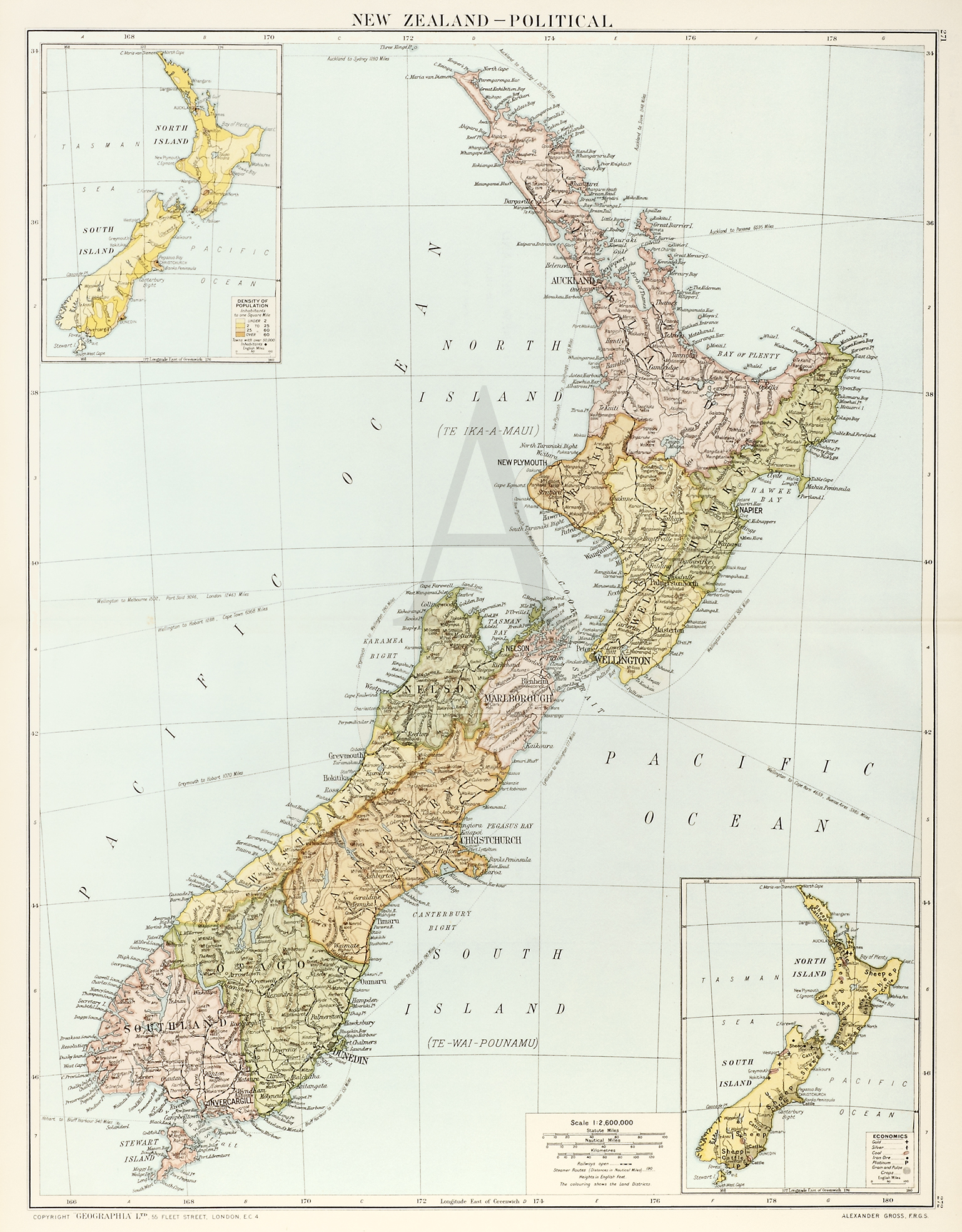 Very detailed early twentieth century map of New Zealand with insets of population density and economic Large scale detailed map with inset of population density at top right and economics. Includes distances between ports.