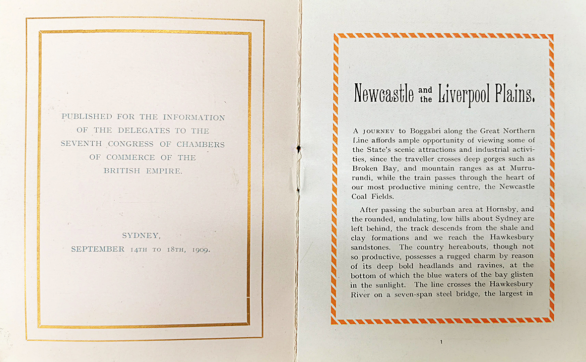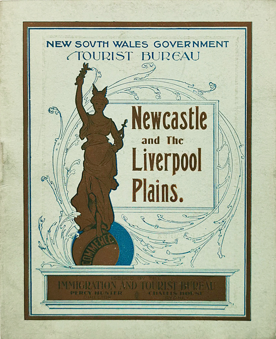 Rare Government Tourist Bureau brochure for the Newcastle and the Liverpool Plains published for information for the delegates to the the 7th Congress of Chambers of Commerce of the British Empire, Sydney September 14th to 18th, 1909. On the back cover are Itinerary of Trips for Monday and Tuesday 20th-22nd, September, 1909. Colour pictorial cover with gold printing, 16 pp, numerous illustrations and map on the inside back cover.