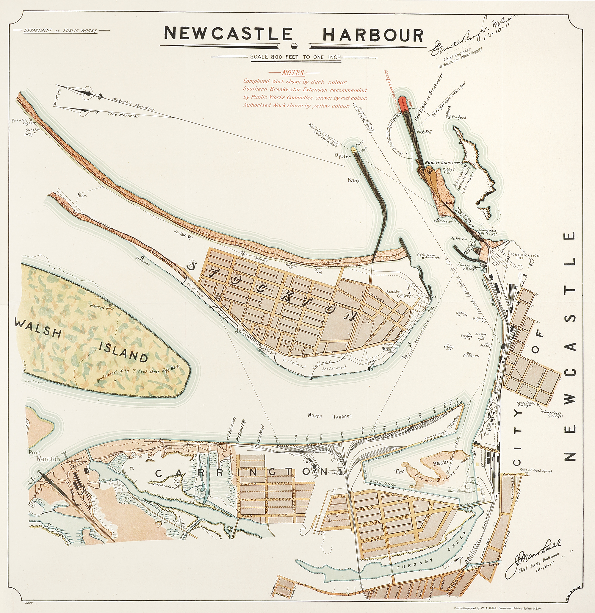 Scarce map of Newcastle Harbour with excellent detail, showing the proposed extension of the southern breakwater by 460 feet (140m).