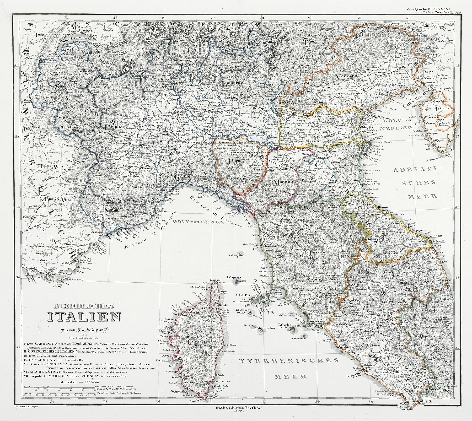 Detailed c.19th German map of northern Italy and a key within the lower margin. From Stieler’s, A. Hand Atlas. Gotha, Germany. Collections: National Library Australia: Bib ID 6850116 (1871 edition) State Library Victoria: SLV_VOYAGER3661362 State Library New South Wales: R.I. 74VKVELObVlg