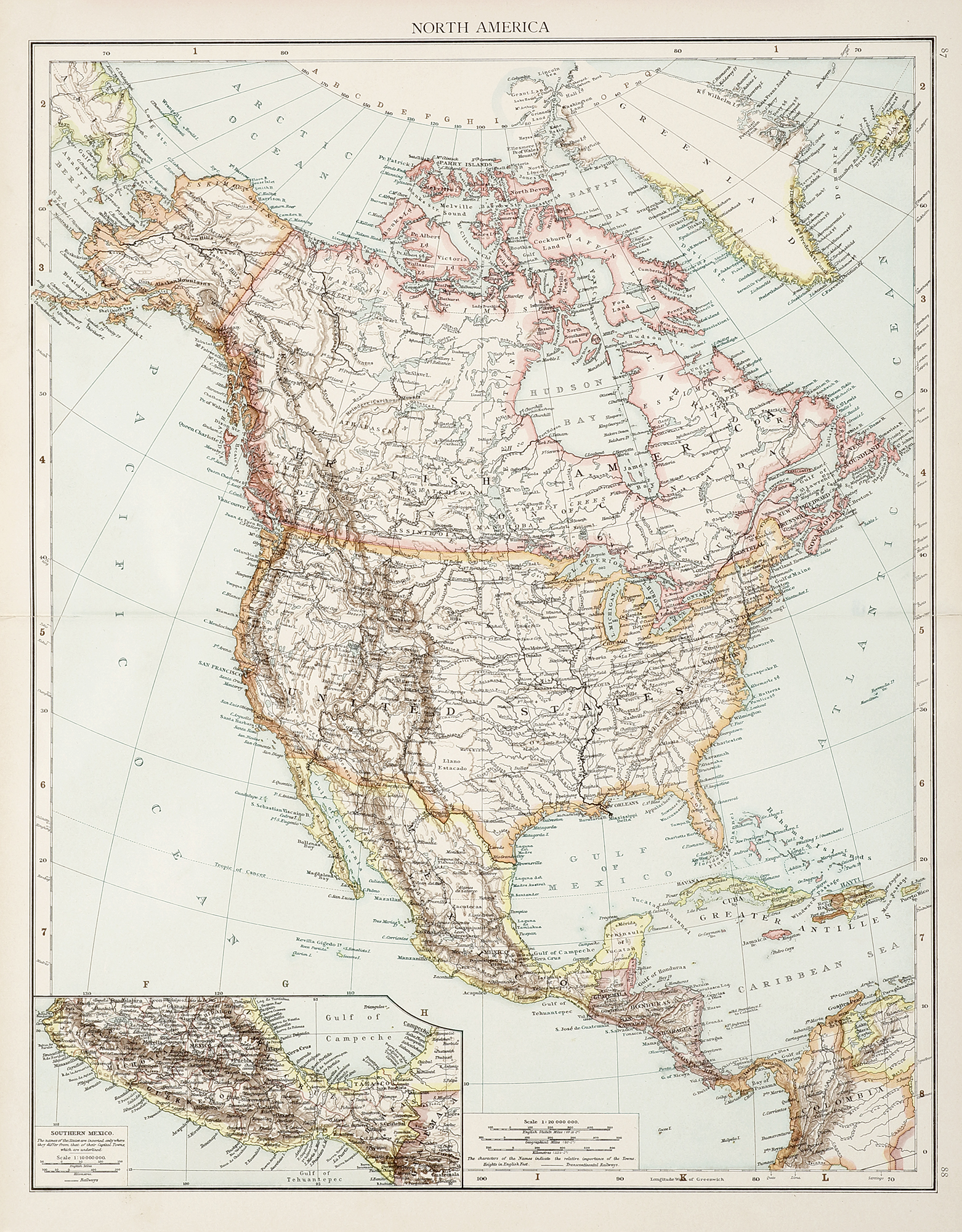 Very detailed map of North America with an inset of Southern Mexico, at lower left. From The Times Atlas which was the English issue of Richard Andree’s, Allgemiener Handatlas’ and one of the most comprehensive world atlases for its time.