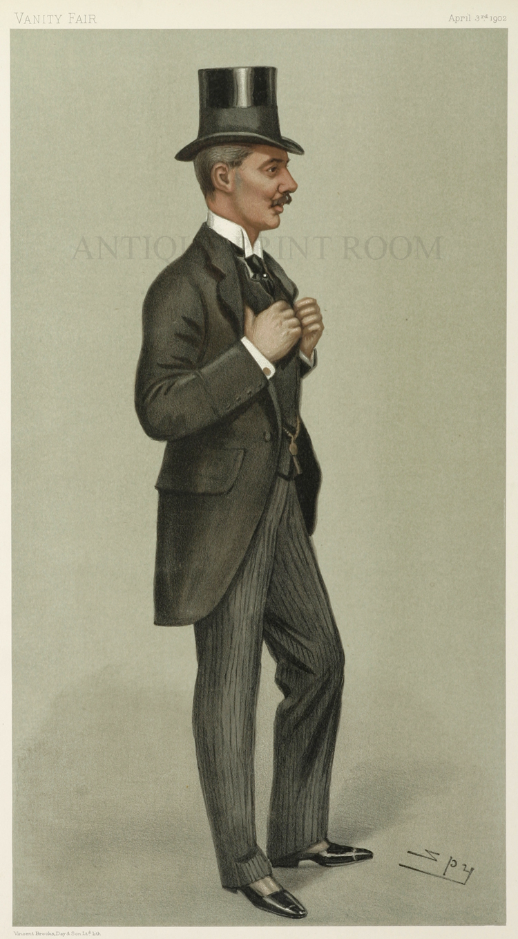 Such was his influence in the genre that all Vanity Fair caricatures are sometimes referred to as “Spy Cartoons” regardless of who the artist actually was. Early portraits, almost always full-length (judges at the bench being the main exception), had a stronger element of caricature and usually distorted the proportions of the body, with a very large head and upper body supported on much smaller lower parts. Later, as he became socially accepted in the society in which he moved to gain access to his subjects, and not wishing to cause offence, his style developed into what he called ‘characteristic portraits’, being less of a caricature and more of an actual portrait of the subject, using realistic body proportions.