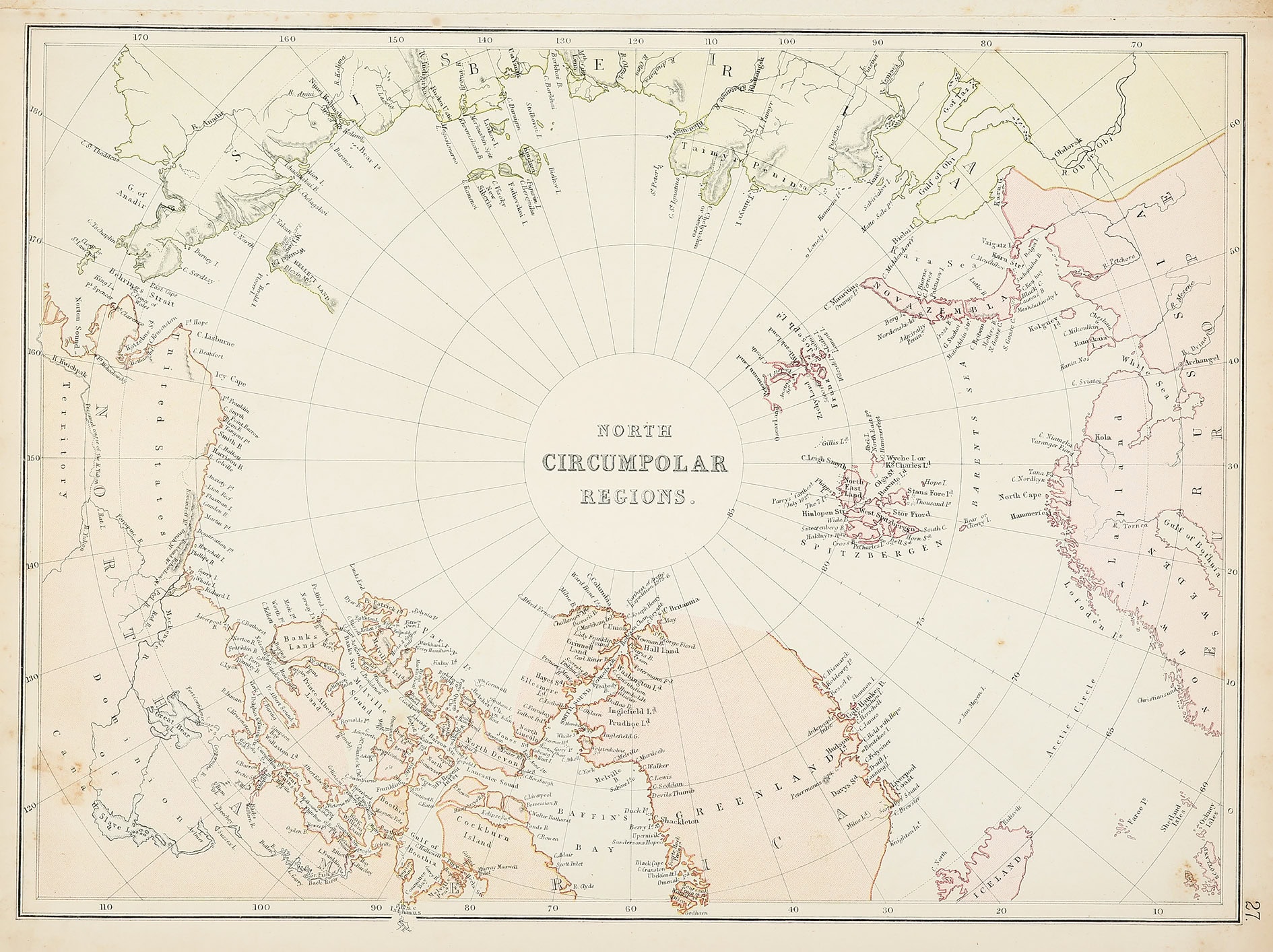 A note above Greenland states; Farthest of Arctic Expedition 1875-6. The British Arctic Expedition was led by Sir George Nares, who was sent by the British Admiralty to attempt to reach the North Pole via Smith Sound on the west coast of Greenland. Although the expedition failed to reach the North Pole, the coasts of Greenland and Ellesmere Island were extensively explored and large amounts of scientific data were collected.