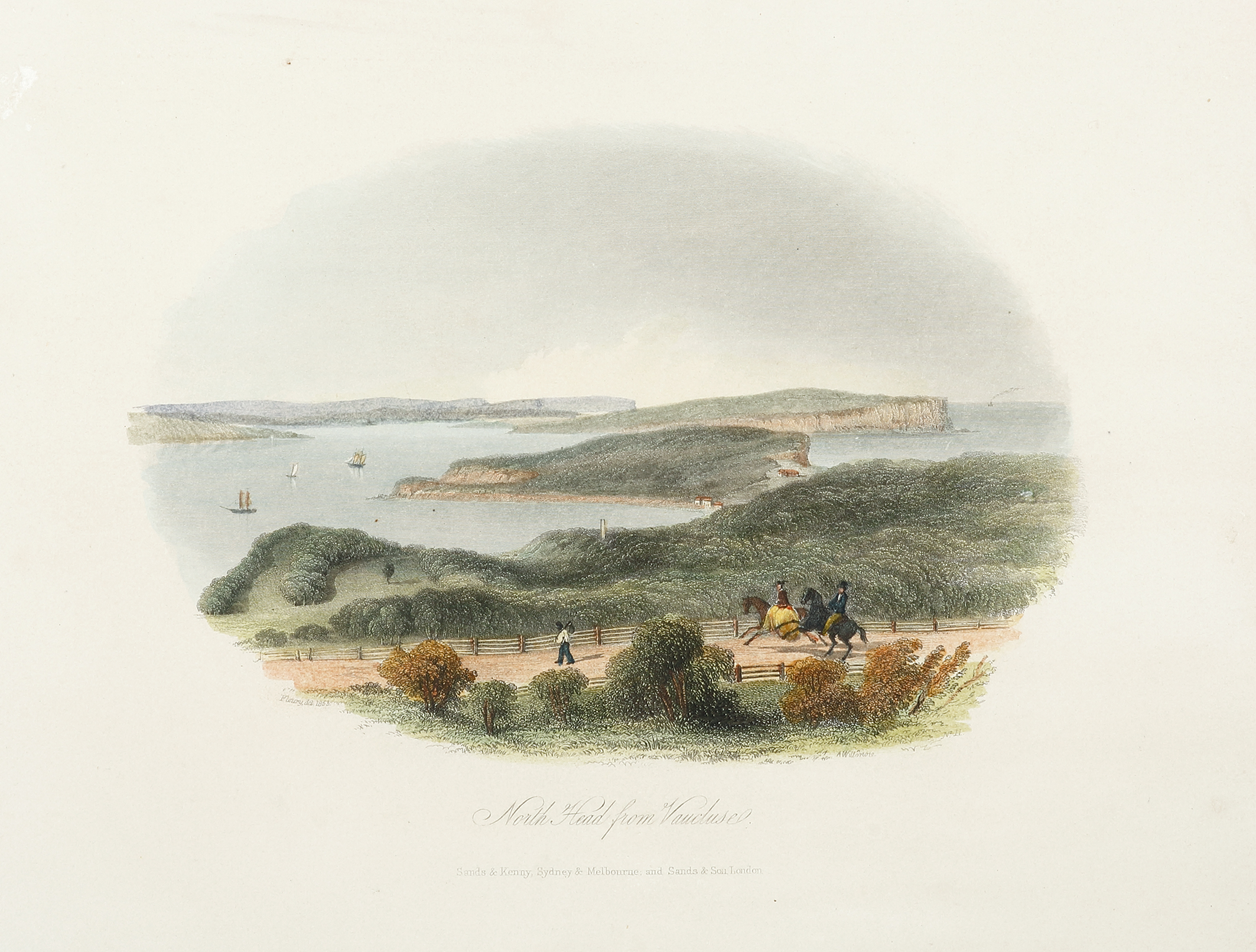 Scarce, hand coloured engraved taken from the vantage of Vaucluse looking across to North Head at the entrance of Sydney Harbour.