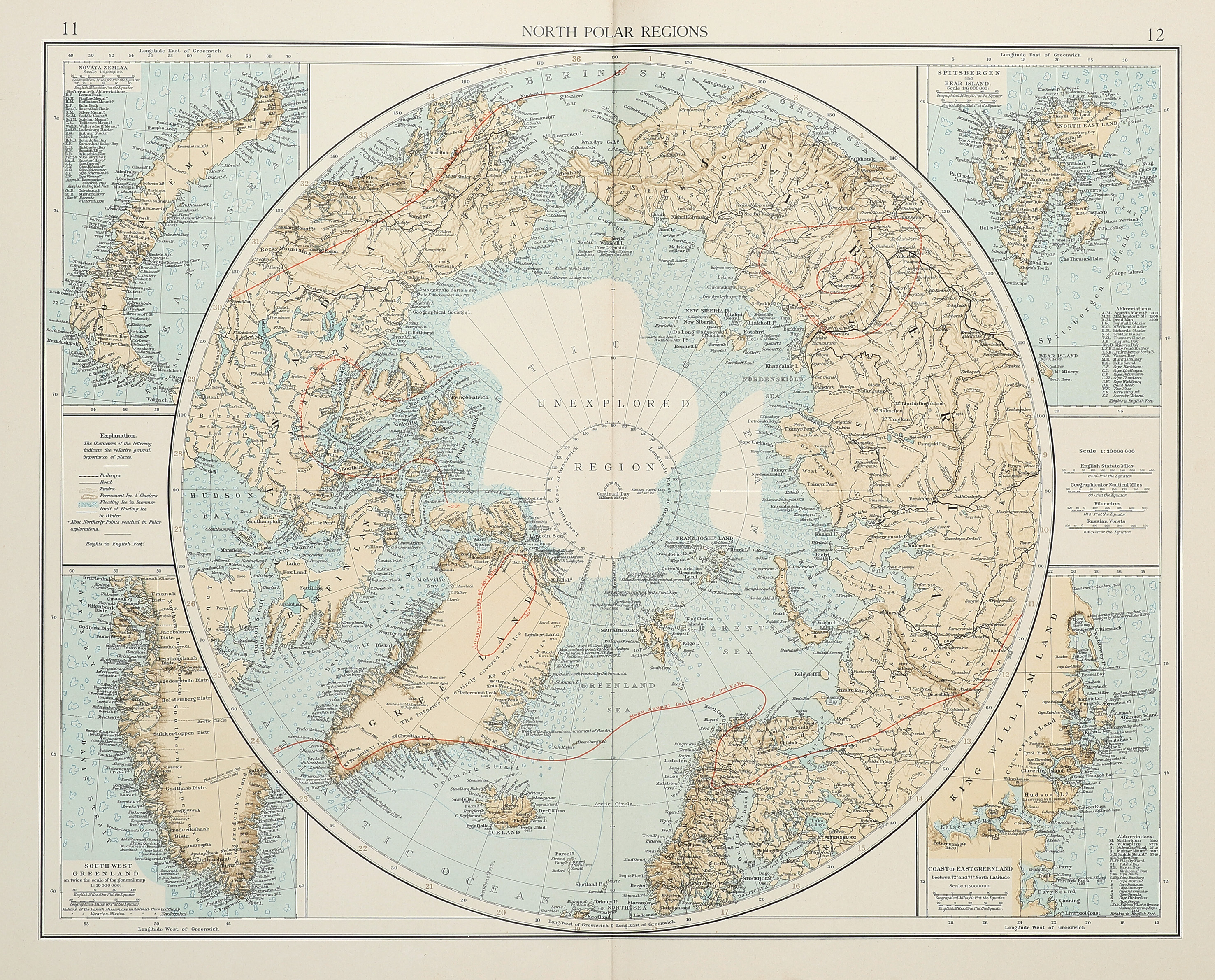 A scarce, very detailed, c.20th-century large scale colour-printed map of the North Pole, from the first edition, third state of The Times Atlas. There are four insets; Top left       :  Novaya Zemblya Top right     :  Spitsbergen Lower … Read Full Description