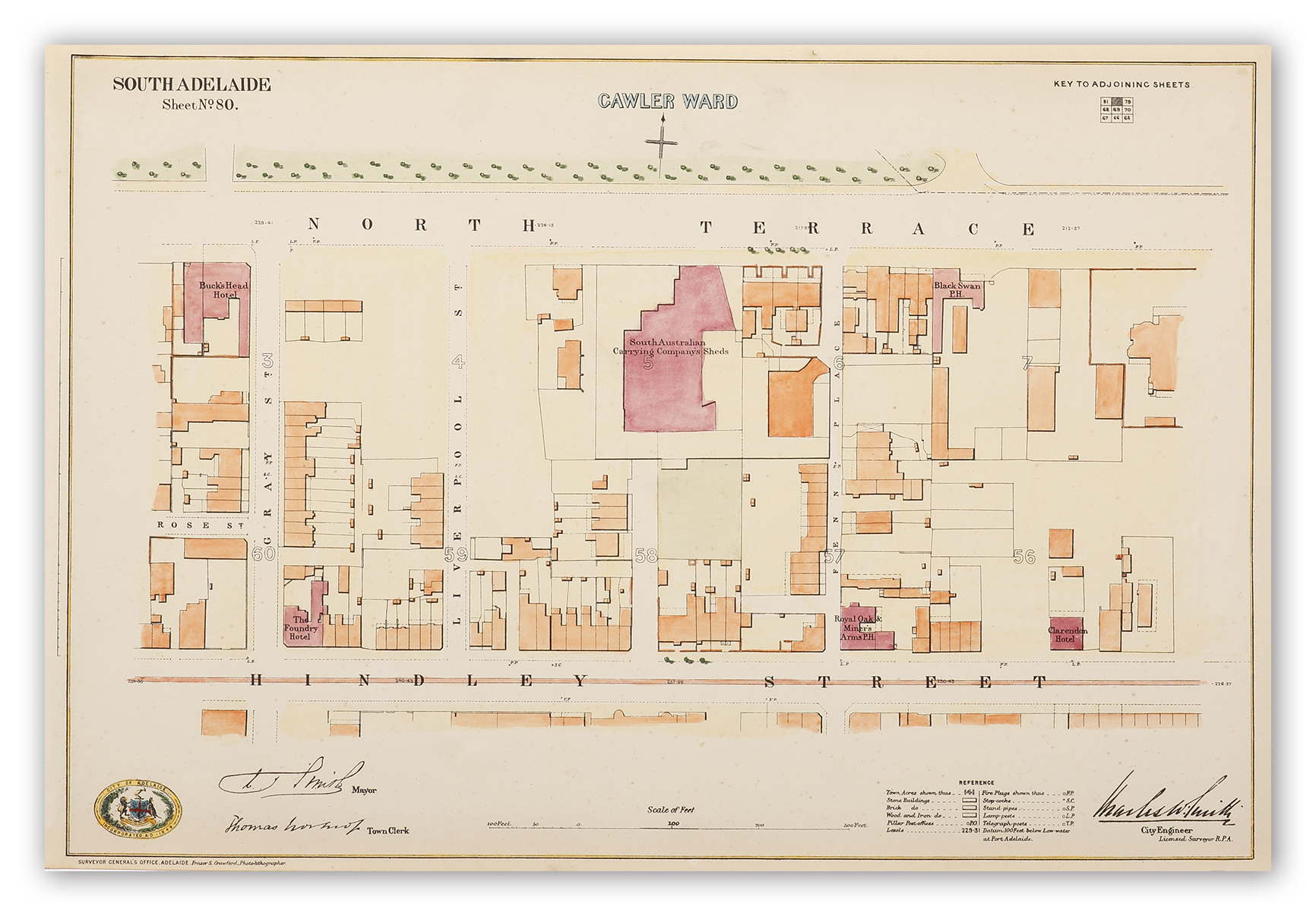 In July 1877 the Adelaide City Council commissioned the eminent English engineer, William Clark (1821-1880) to assess and propose a system of drainage for the city of Adelaide. Clark’s proposal was accepted and prior to commencement of the works Clark required a detailed cadastral survey of the city to be made. On 18 February 1878 the Council instructed John Lloyd Hyndman (1836 – 1878) the City Engineer and Surveyor to prepare a large detailed plan of the city of Adelaide to show; permanent from temporary buildings, the levels not only of the street surfaces, but of the back yards, the levels and positions of cellars where they exist, and points where drainage will be required, such as kitchen sinks, water taps, stack pipes, water closets on a scale of 40 feet to the inch. Work proceeded but on 4th August 1878, Hyndman unexpectedly died and was replaced by the engineer Charles William Smith.