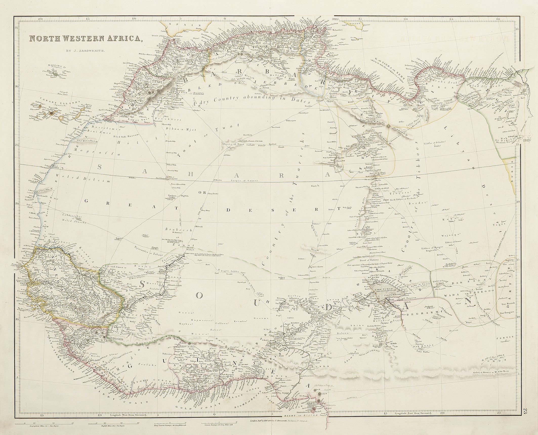 Superb first edition of Arrowsmith’s very detailed map of north west Africa, dated 15th Feb. 1834 on the plate but first published in his London atlas in 1834.
