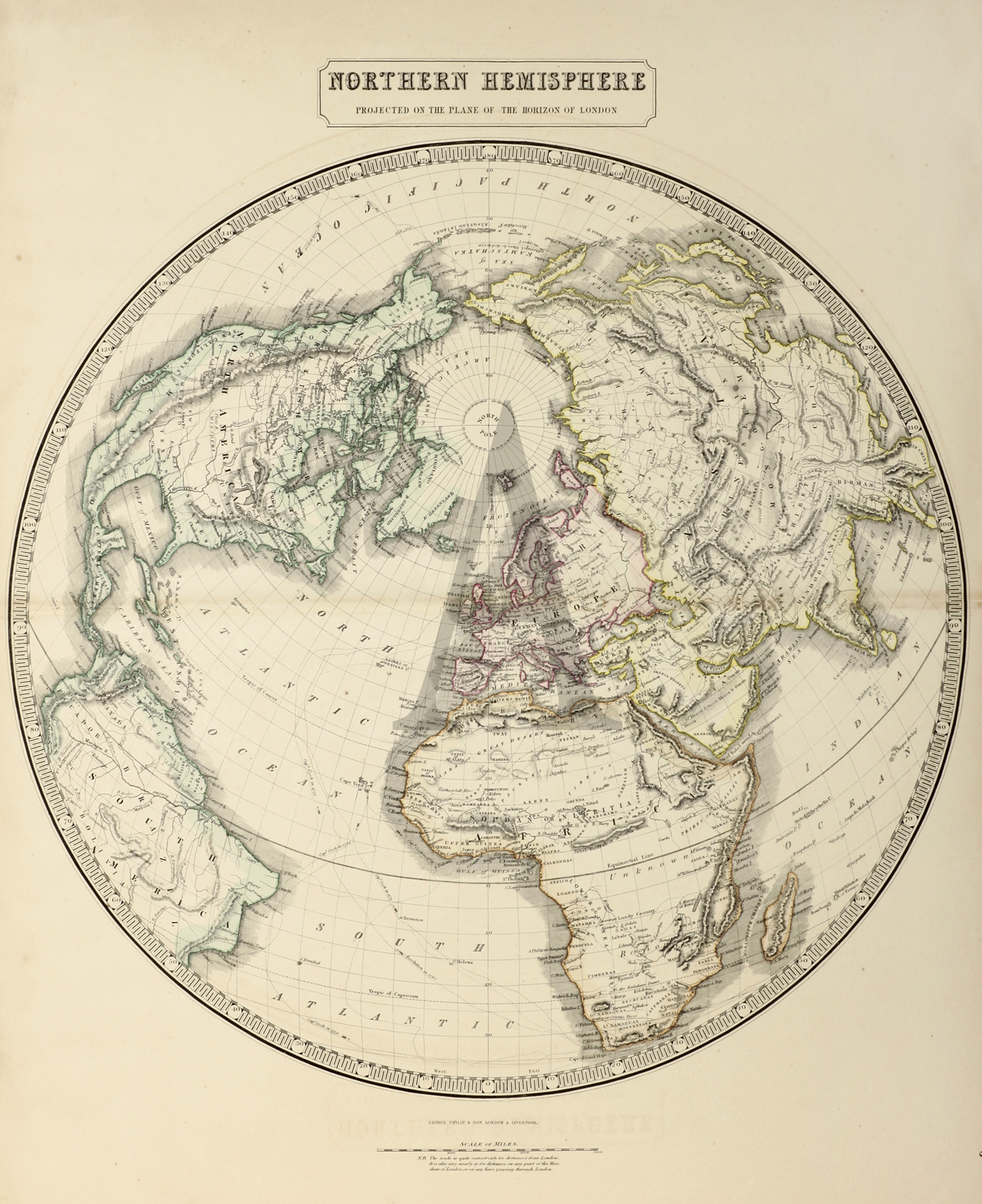 Large scale map of the northern hemisphere from Philips’ New General Atlas. The tracks of Cook’s voyages are marked. Sold un-matted.