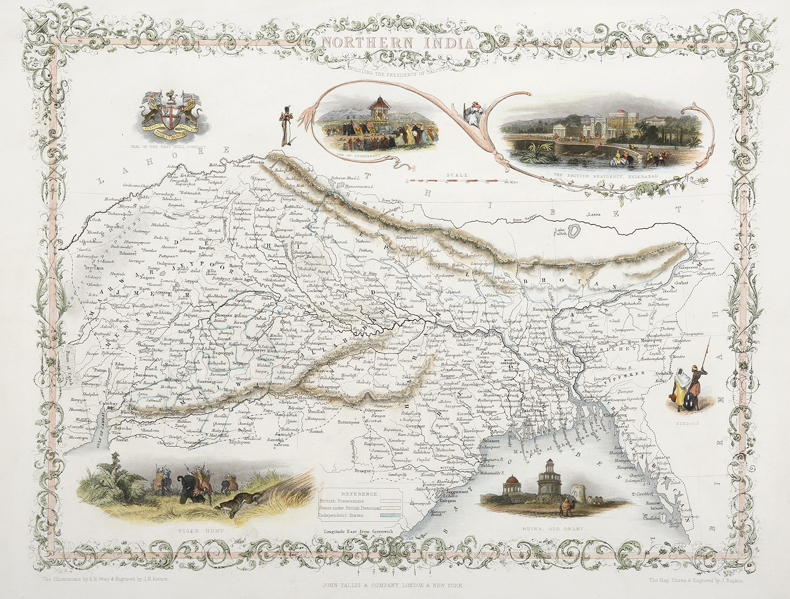 Fully hand coloured example of one the most decorative c.19th maps of northern India from The Illustrated Atlas by John Tallis.
