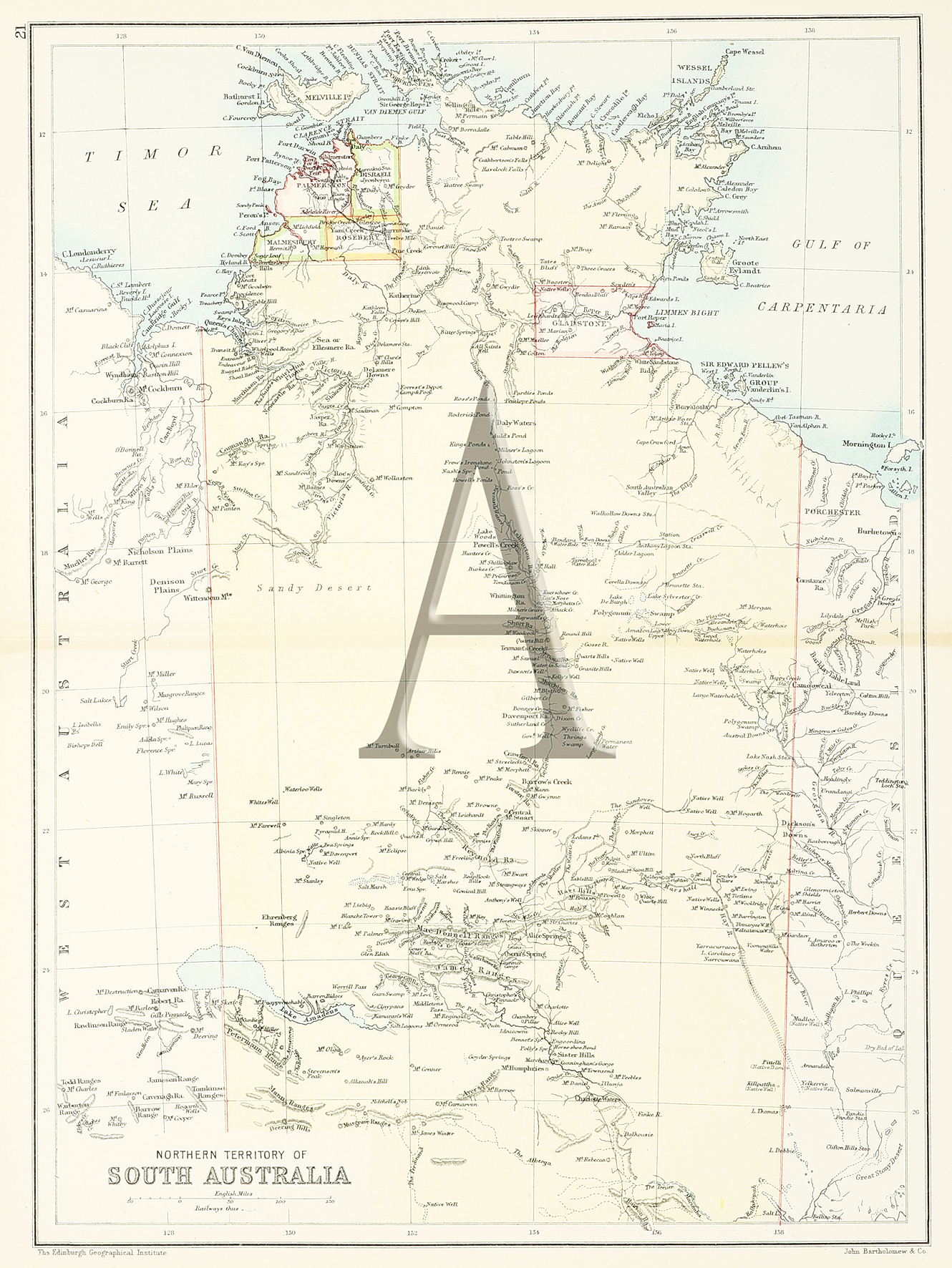 Scarce detailed c.19th colour engraved map of the Northern Territory with five counties delineated.