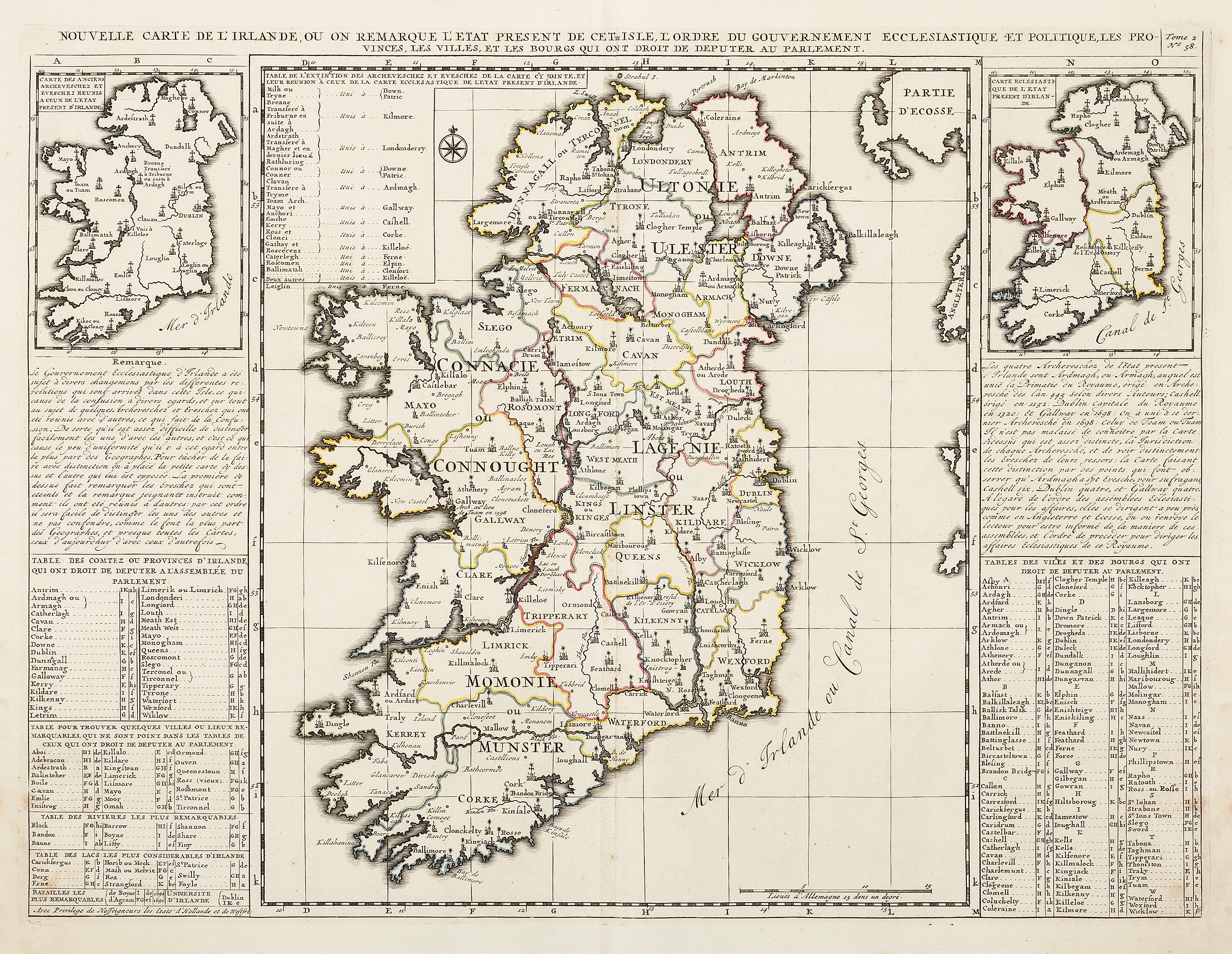 Scarce, detailed c.18th hand coloured engraved map of Ireland with two inset maps and tables at top and lower left and right. From: Chatelain, A. & Z., Atlas historique, ou Nouvelle introduction à l’histoire, à la chronologie et à la géographie … Read Full Description