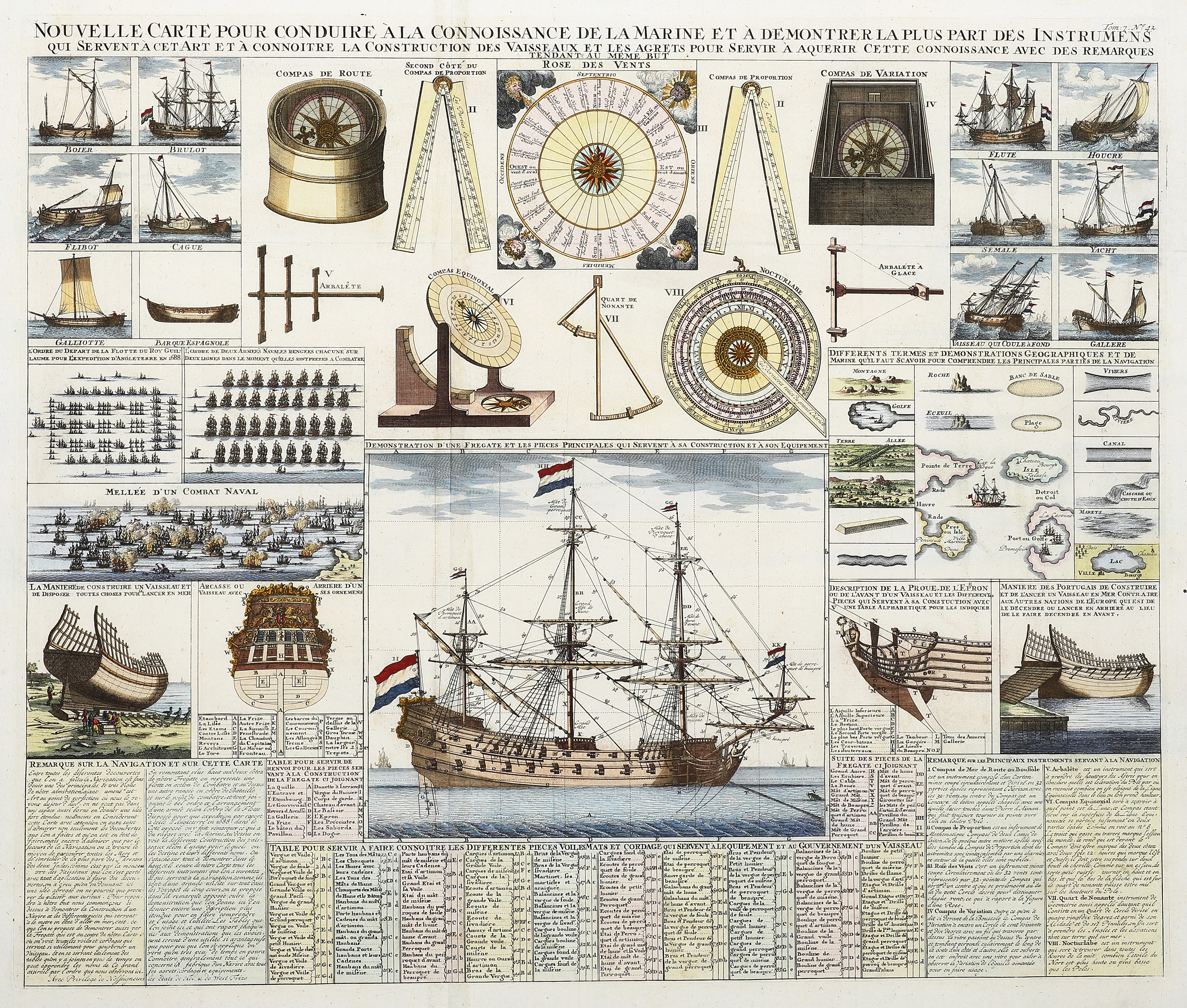 Large c.18th hand coloured engraving depicting nautical insturments, various boats, rigging terms, mapping terms and naval formations. From Chatelain, H. Atlas historique, ou Nouvelle introduction à l’histoire, à la chronologie et à la géographie ancienne et moderne,…. References:Shirley, R. Maps in … Read Full Description